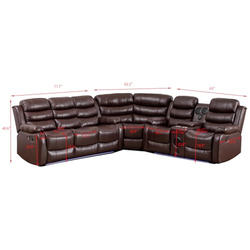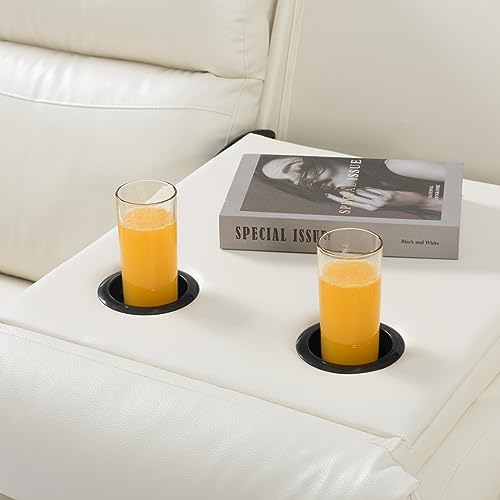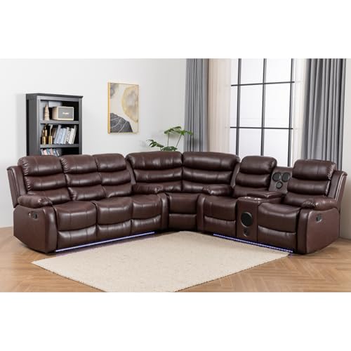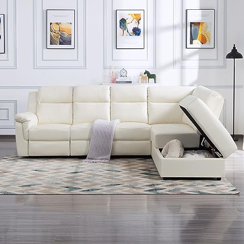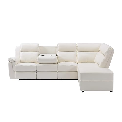 Manual Reclining Sectional Couch with LED Light Multi-Functional Sofa with Recliner Seat,Stereo, Storage,Cup Holders,USB,PU Leather L-Shaped Sofa,9 Seater for Living Room- White