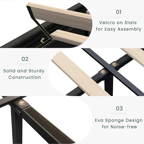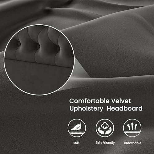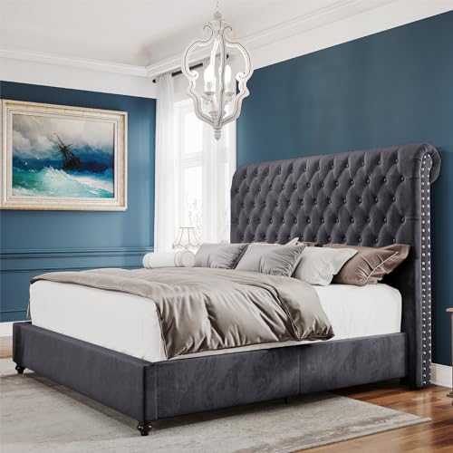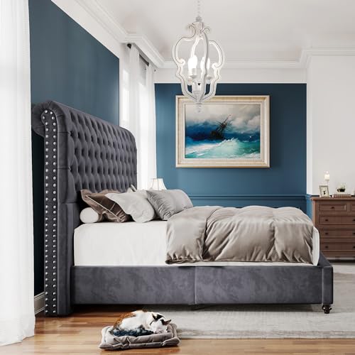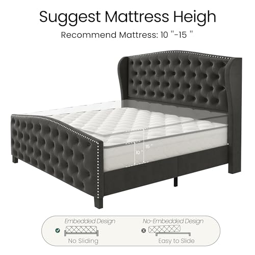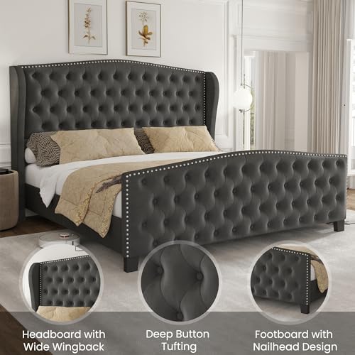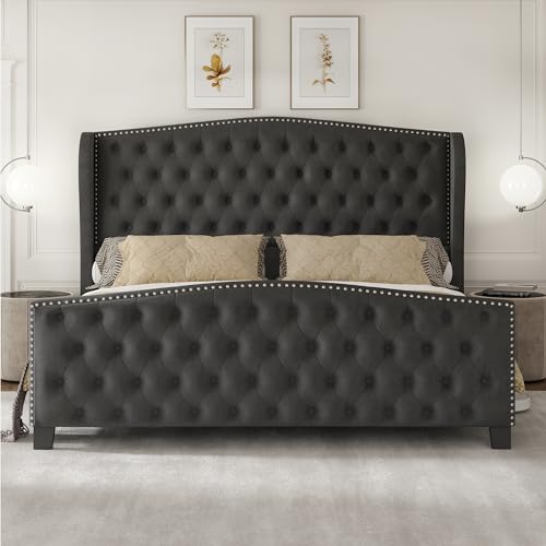 Queen Bed Frame Upholstered Platform Bed with Wingback Headboard & Footbaord Velvet Beds Deep Button Tufted Beds Frames with Wood Slats Support, No Box Spring Needed, Beige