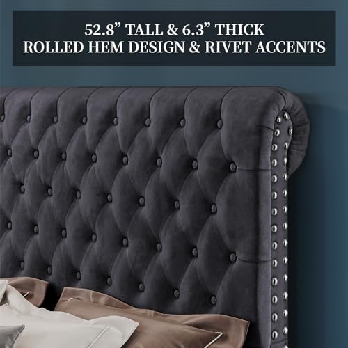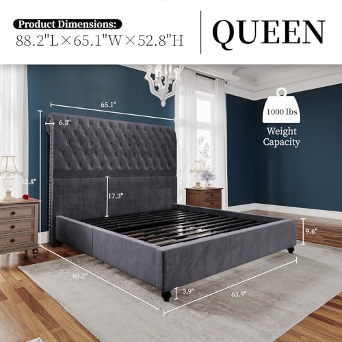 Bed Frame Queen Size Upholstered Platform Bed with 52.8'' Tall Sleigh Headboard, Button Tufted, No Box Spring Needed, Easy Assembly, Cream