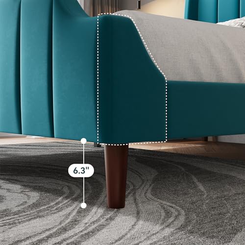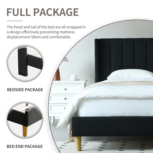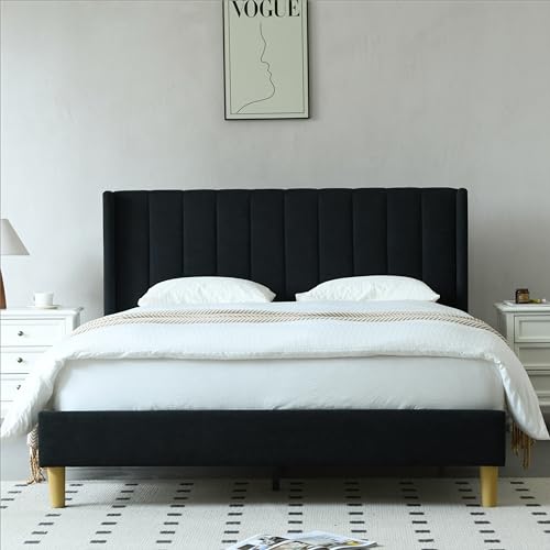 HOOMIC Queen Size Upholstered Velvet Bed Frame with Curved Vertical Wingback Headboard and Footboard, Solid Wood Slats Support, No Box Spring Needed, Easy Assembly, Navy Blue