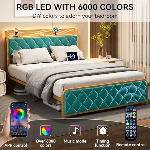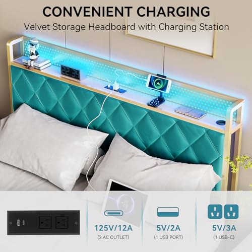 King Size Bed Frame, Velvet Upholstered Platform Bed with Storage Headboard, LED Light Headboard, Charging Station, USB Ports & Outlets, Strong Frame and Slats Support, No Box Spring Needed