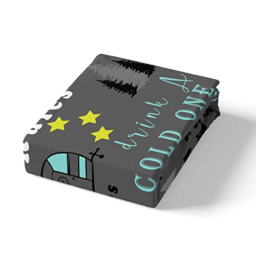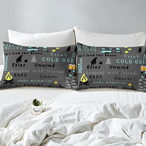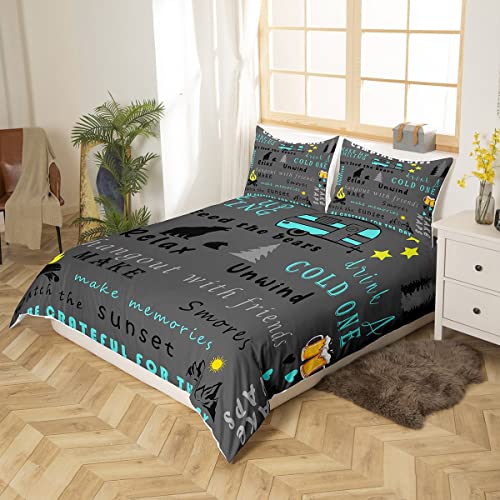 Camper Queen Duvet Cover Full Size, Rustic Farmhouse Bedding Set for Kids Boys Girls Youth Adults Bedroom Decor, Happy Camping Comforter Cover Sketch Drawing Quilt Cover, Zipper Closure, Teal