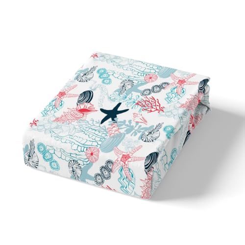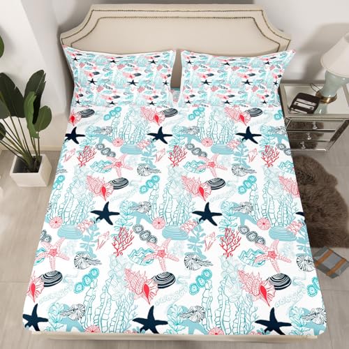 Seashell Conch Starfish Coral Sheet Set Full Size,Coastal Ocean Beach Bedding Set 4Pcs,Underwater Life Print Bed Sheet Navy Blue Tie Dye Fitted + Flat Sheet for Kids Teens Adult Bedroom Decor