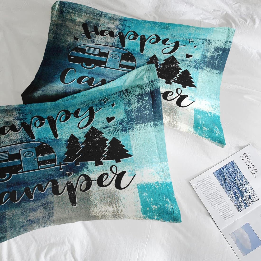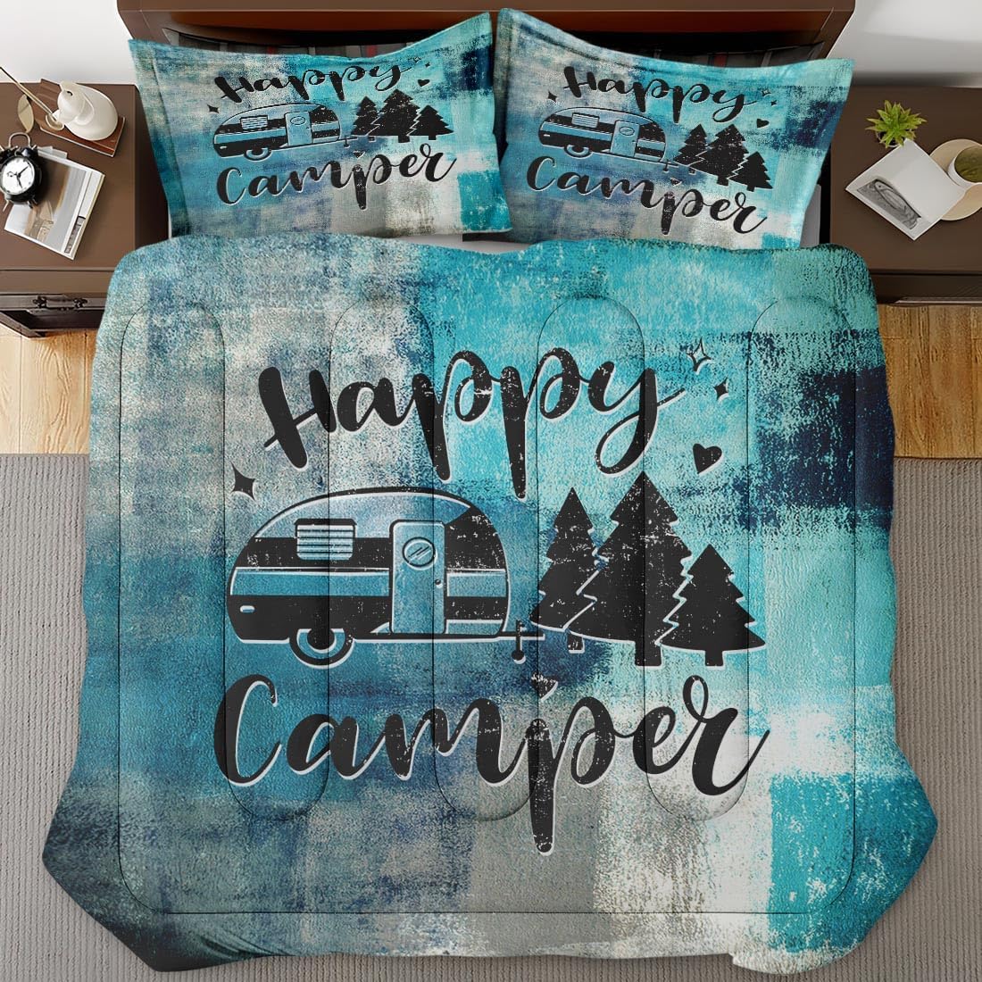 Turquoise Grey Painting Comforter Set Full Size, Happy Camper Teal Soft Bedding Set with 2 Pillowcases for Girls Teens Kids Boys Adults Bedroom Bed Decor,1 Quilt 2 Pillow Cases