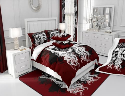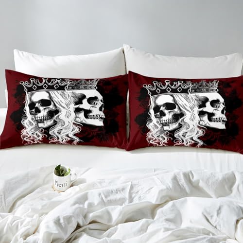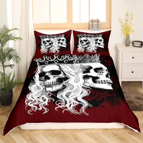 Manfei Skeleton Couple Duvet Cover Set Full Size, Gothic Skull Comforter Cover with 2 Pillowcases, Purple Rose Flower Bedding Set 3pcs for Kids Girls Adults Bedroom Decor Lightweight Bedspread Cover
