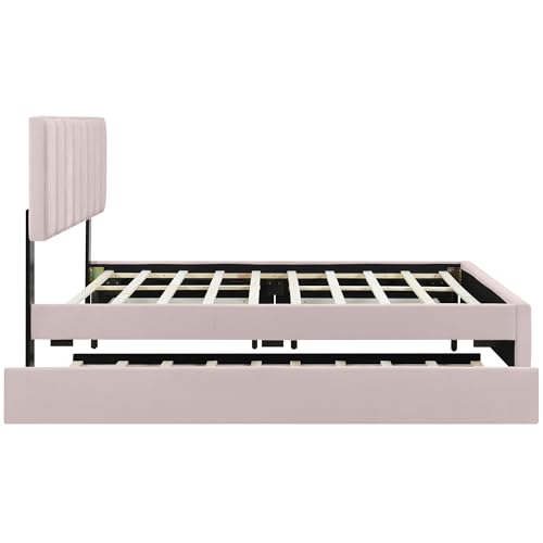 Queen Size Upholstered Platform Bed with 2 Drawers and 1 Double Trundle, Velvet Upholstered Bed Frame with Classic Metal Strip Headboard Design for Kids Teens Adult, No Box Spring Needed (Pink-5C1)