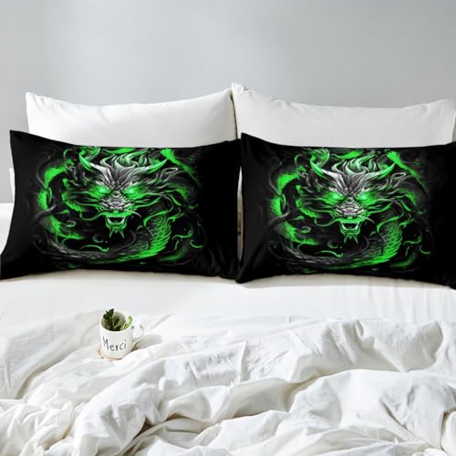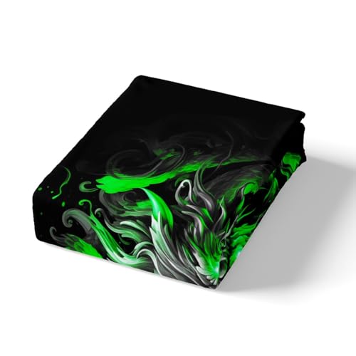 3D Dragon Fitted Sheet Full Size,Neon Green Flame Dragon Bed Sheets for Kids Boys Men Adult Bedroom Decor,Wildlife Animals Bedding Set Cool Magical Black Deep Pocket Sheet 3Pcs,2 Pillowcases