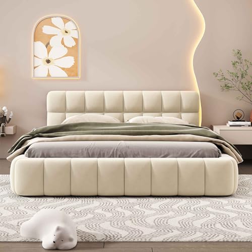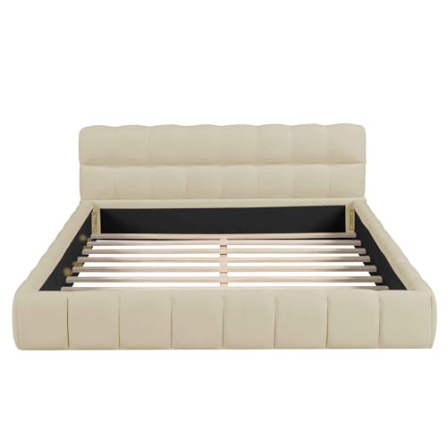 Full Size Platform Bed with Flower Pattern Headboard, Upholstered Bedframe w/Wood Slat Support, Easy to Assembly and No Box Spring Need, 76.8" L X 58.1" W X 47.4" H, Beige