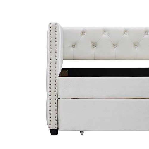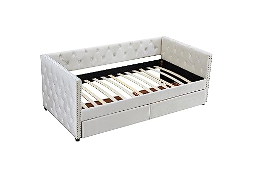 Velvet Upholstered Daybed with Double Drawers, Modern Twin Size Day Bed Button-Tufted Sofa Daybed Frame for Bedroom Living Guest Room, No Box Spring Needed (Beige 067)
