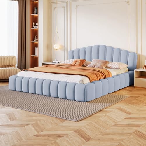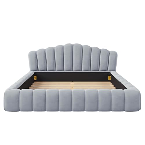 Unique Queen Size Velvet Upholstered Platform Bed with Shell-Shaped Headboard,for Kids Teens Adults Bedroom Use (Beige@Shell, Queen)