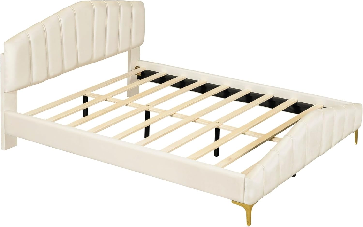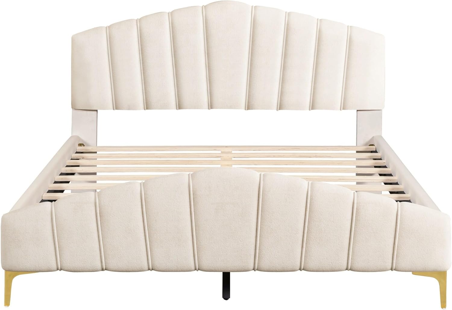 Modern Queen Size Bed Frame Velvet Upholstered Platform with Stripe Headboard Master Bedroom Double Beige Contemporary Includes Hardware
