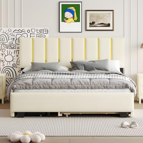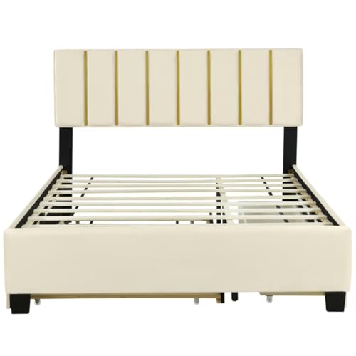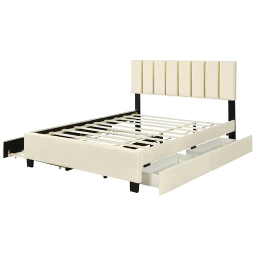 Velvet Twin Daybed with Storage, Upholstered Day Bed Twin Size with Drawers and Headboard, Solid Wood Bed Frame for Living Room and Bedroom, No Box Spring Needed (Beige Velvet)