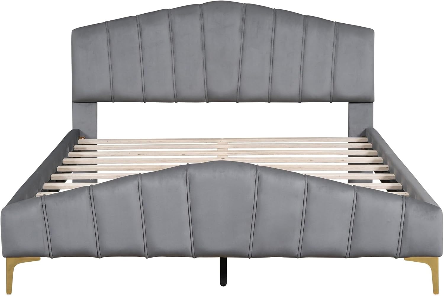 Modern Queen Size Bed Frame Velvet Upholstered Platform with Stripe Headboard Master Bedroom Double Gray Grey Contemporary Includes Hardware