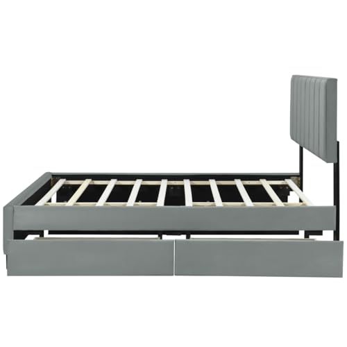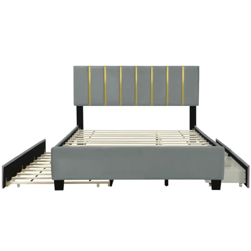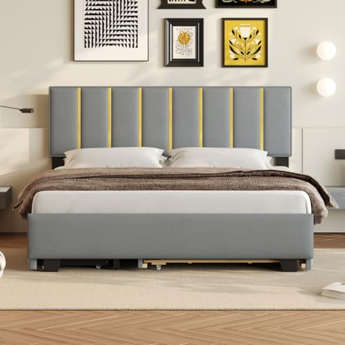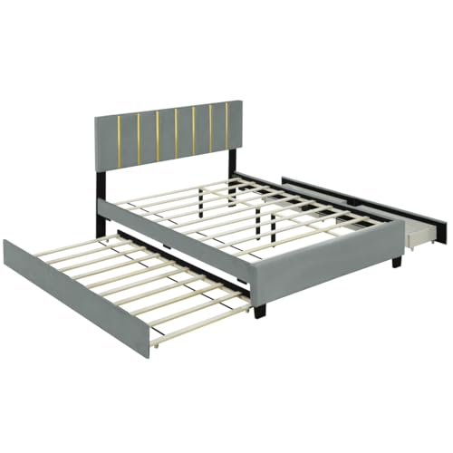 Queen Size Bed Frame with Metal Strip Design Upholstered Headboard, Modern Velvet Platform Bed for Bedroom with Trundle and 2 Drawers, No Box Spring Needed, for Kids Boys Girls, Pink