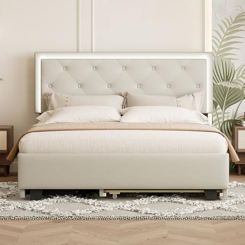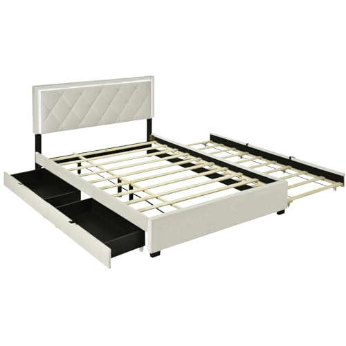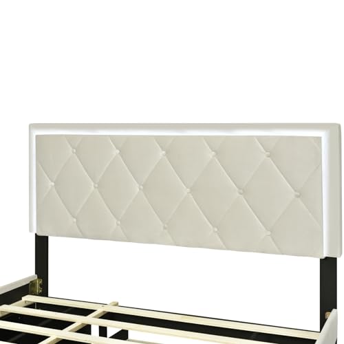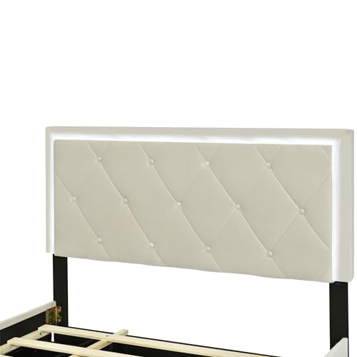 Velvet Upholstered Queen Size Platform Bed with 2 Storage Drawers and Twin XL Trundle, Headboard Built-in LED Light for Adults Boys Girls, No Box Spring Needed (Beige-015)