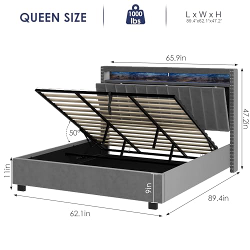 Upholstered Bed Queen Size with LED light, Bluetooth Player and USB Charging, Hydraulic Storage Bed in Beige Velvet Fabric