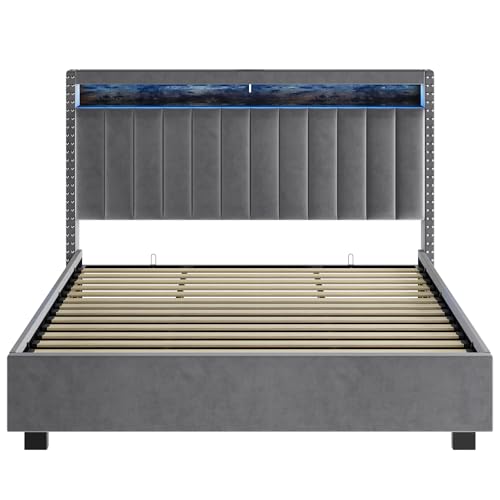 Full Size Lift Up Storage Bed,Bookshelf Frame with Led Light & USB Charging Port,Upholstered Platform Bed,Hydraulic System Smart Bed,Easy to Assemble Noiseless (Blue, Full)