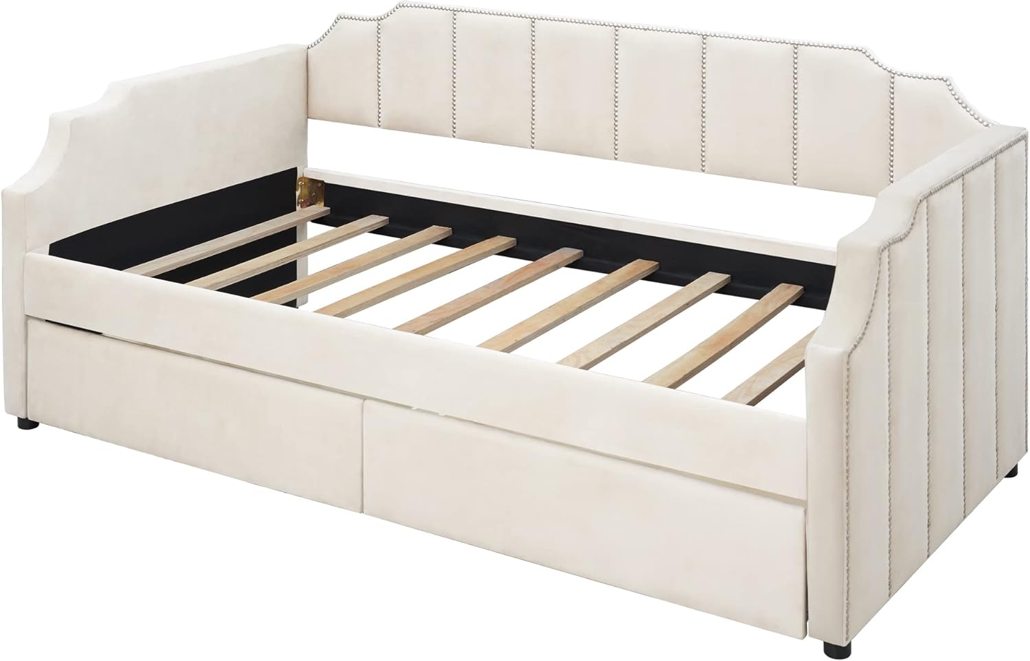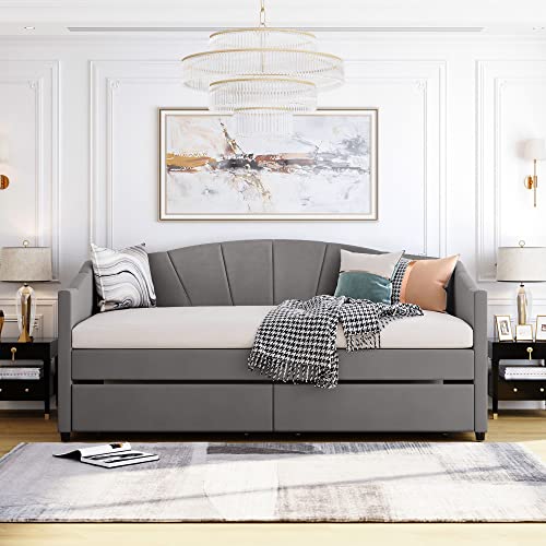 Twin Size Upholstered Daybed with Two Drawers, Elegant Velvet Fabric Sofa Bed with Wood Slat Suppot for Living Room Bedroom, No Box Spring Needed (Gray+Two Drawers+Velvet)