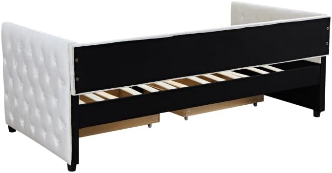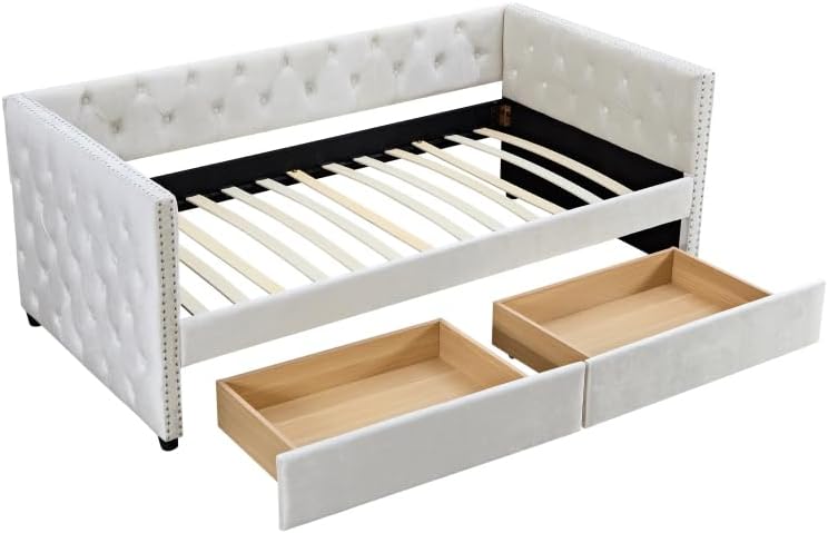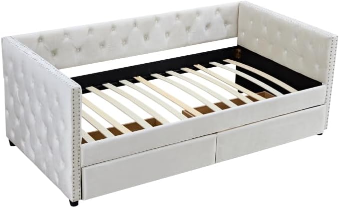 Sofa Bed with Drawers, Modern Velvet Upholstered Sofa Bed with Button Tufted Sofa Bed Frame with Double Drawers, Bedroom Living Room Furniture,Beige (83.47"X42.91"X30.71"') Wood