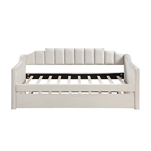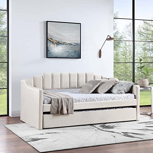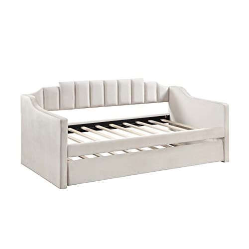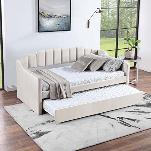 Antetek Daybed with Trundle, New Velvet Upholstered Twin Size Sofa Day Bed Frame with A Roll-Out Trundle, No Box Spring Needed, Furniture for Bedroom Living Room Bedroom Guest Room (Beige, Twin)