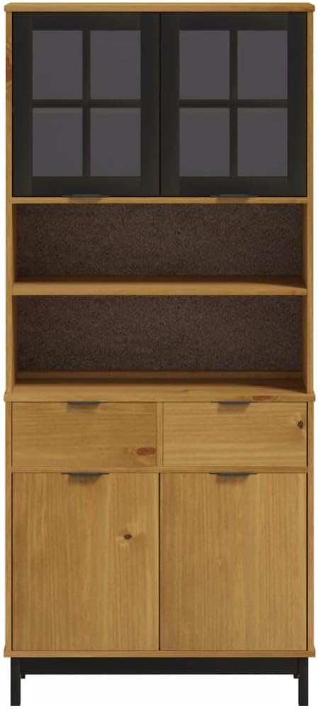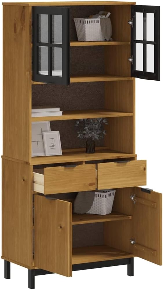 XAVIER Sideboard Cabinet、Storage Cabinet、Kitchen Decor、Entryway Cabinet Highboard with Glass Doors FLAM 31.5"x15.7"x70.9" Solid Wood Pine Suitable for Kitchen, Dining Room, Home, Office