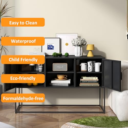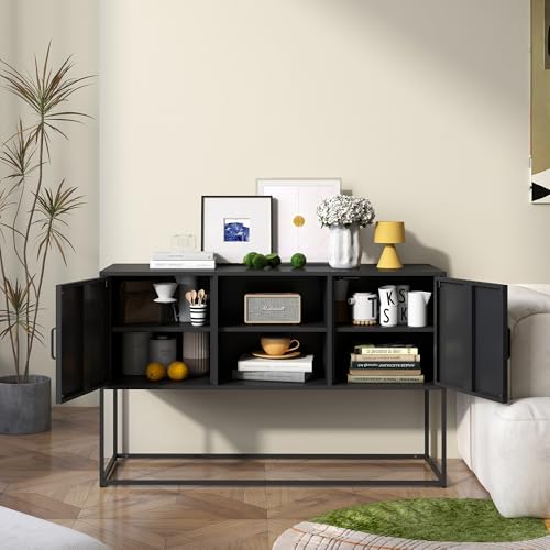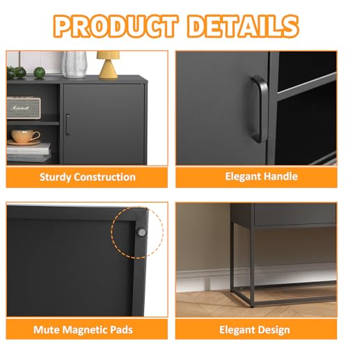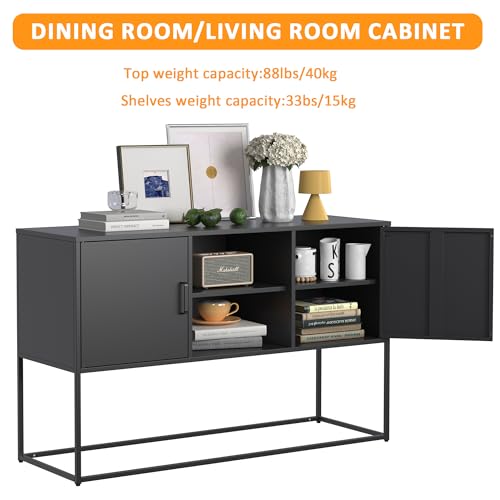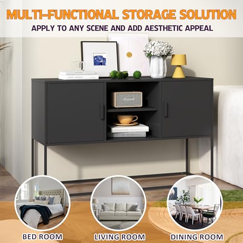 Metal Sideboard Buffet Cabinet, Modern Steel Locker Storage Cabinet with Doors and Shelves, Free Standing Accent Cabinet for Living Room, Kitchen, and Home Office, Anti-Tip Design (Black)