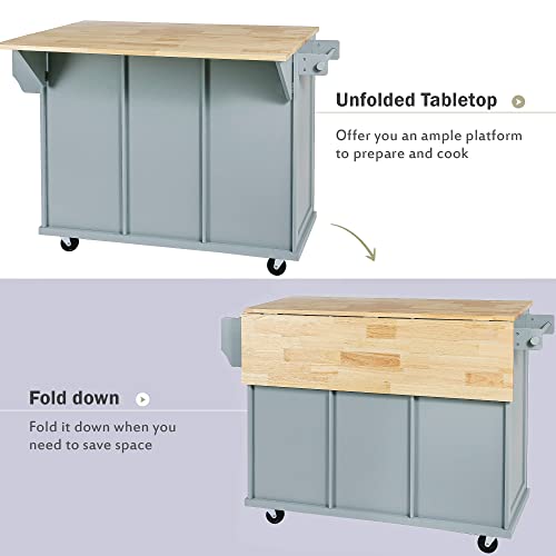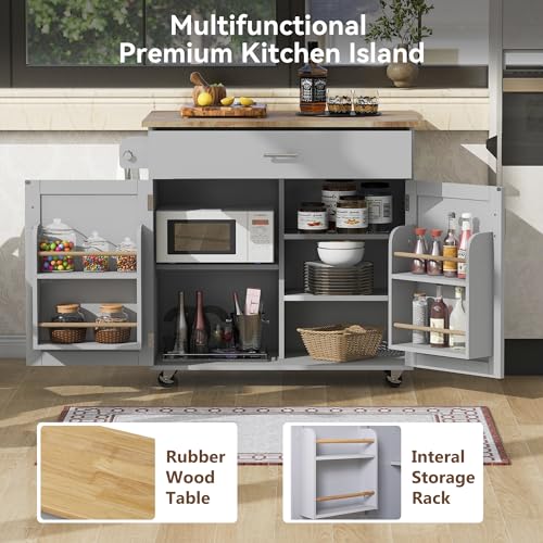 53.5'' Farmhouse Kitchen Island Cart with Power Outlet, Kitchen Island with Storage,Drop Leaf and Spice Rack, Rolling Kitchen Cart on Wheels for Home, Kitchen and Dining Room