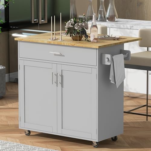 Kitchen Island On Wheels, Rolling Kitchen Carts with Drop Leaf Wooden Countertop and Storage Cabinet, Towel Rack, Wide Drawer for Dining Room/Living Room (White)