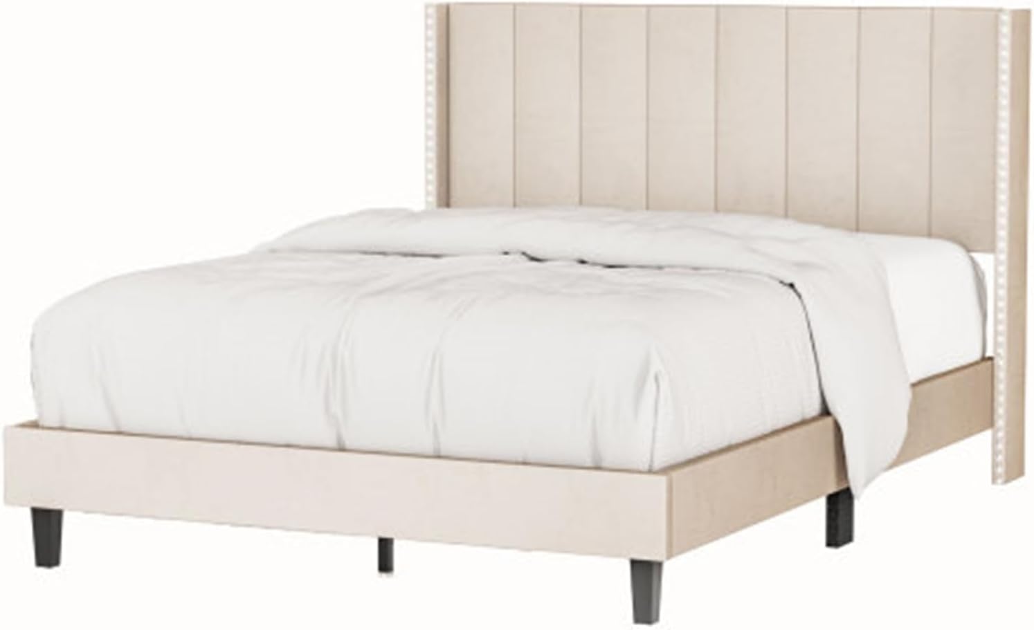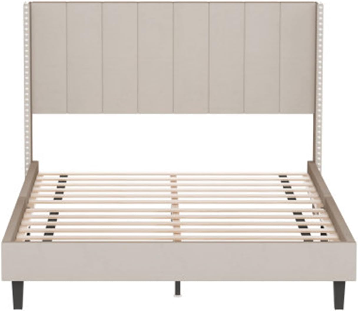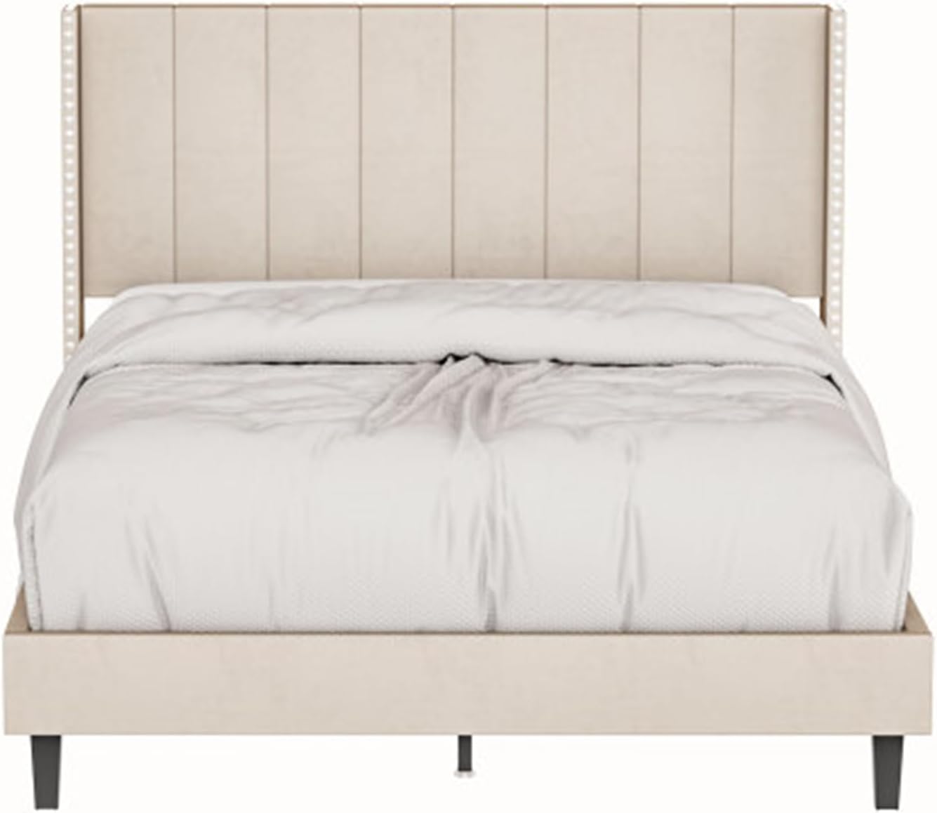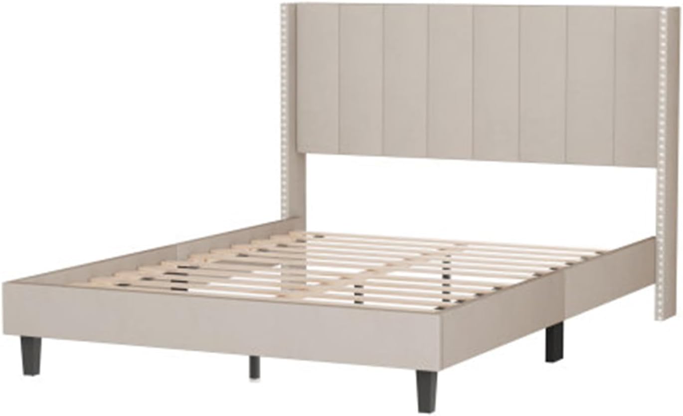 Home Single Double Bed Frame with Headboard Quality Simple Velvet Upholstered Bed Frame Beige