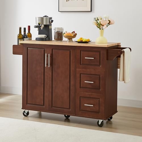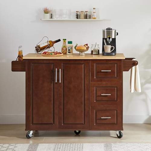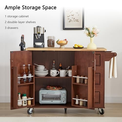 Kitchen Cart with Rubber Wood Drop-Leaf Countertop, Kitchen Island On 5 Wheels with Storage Cabinet, 3 Drawers and Internal Storage Racks, Rolling Mobile Portable Serving Carts (White)