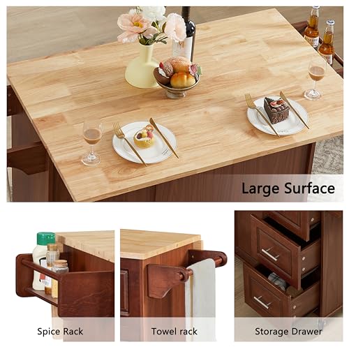 Farmhouse 3 Piece Dining Table Set with 2 Dining Stools, Kitchen Island Set with Drop Leaf, Storage Cabinet, Drawers and Towel Rack, Kitchen Dining Table Set (Solid Wood + White)