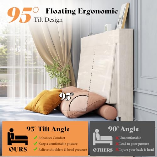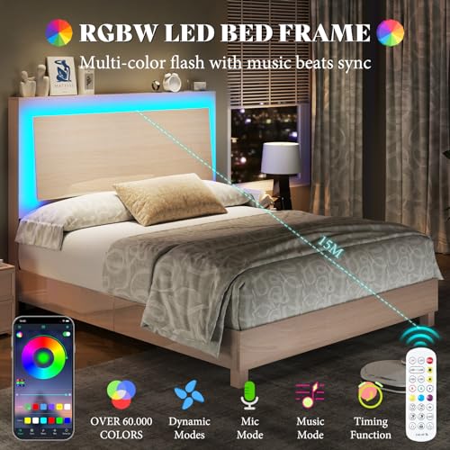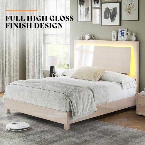 AMERLIFE Full Size Platform Bed Frame with Smart RGBW LED Lights, High Gloss Wooden Bed Frame with Floating Ergonomic Headboard, Slats Support/No Box Spring Needed, White Woodgrain