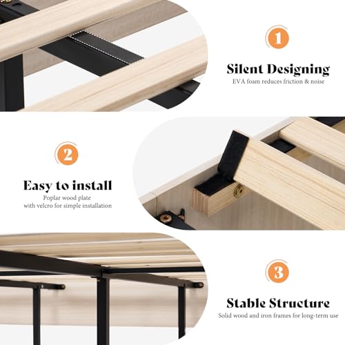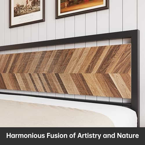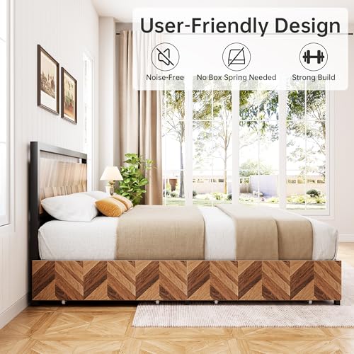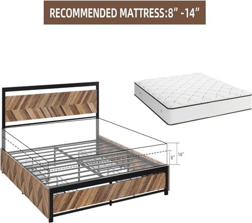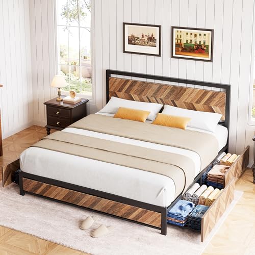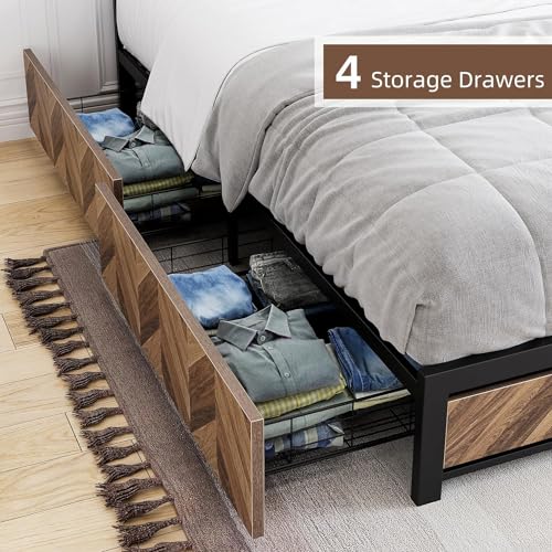 Queen Bed Frame with 4 Storage Drawers, Rustic Vintage Metal Platform Bed Frame with Headboard, Strong Metal Slats Support, No Box Spring Needed, Noise Free, Easy Assemble
