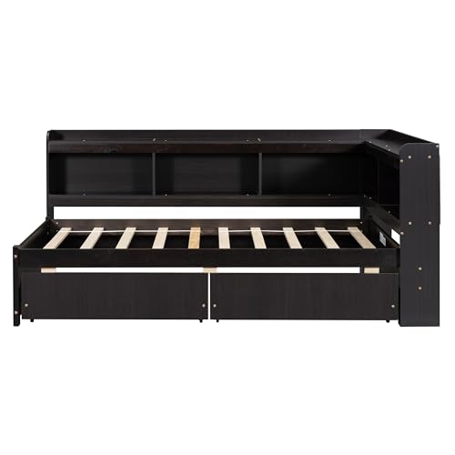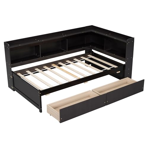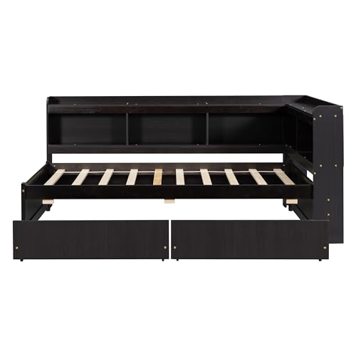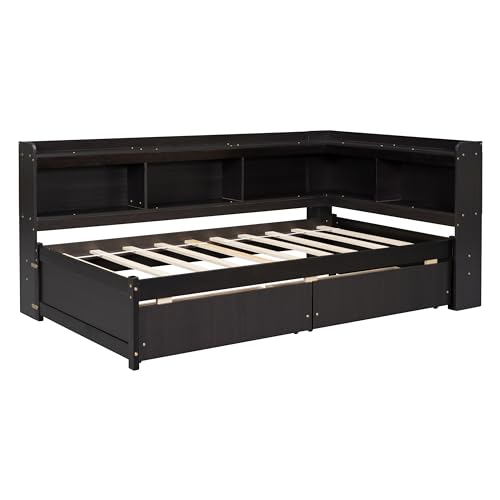 Twin Size Daybed Wooden Day Bed Frame with 2 Drawers and L-Shaped Bookcases, Twin Bed Frame for Kids, Boys, Girls & Teens, No Box Spring Needed, Grey