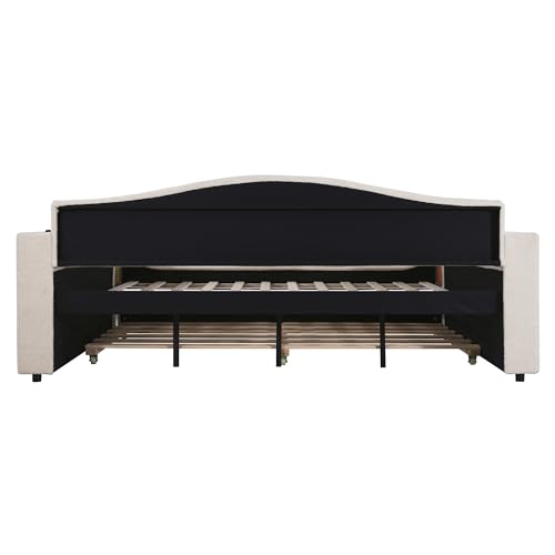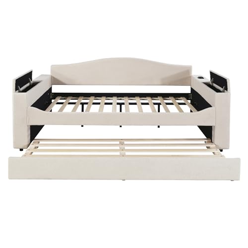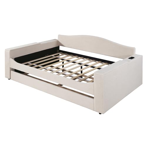 Upholstered Daybed Sofa Bed with Trundle and LED Light, Full Size Wood Daybed Frame with Curved Backrest and Armrests for Kids Adults Bedroom Furniture, Teddy Fleece Smart LED Bed (Beige)