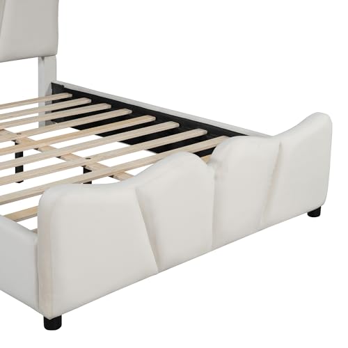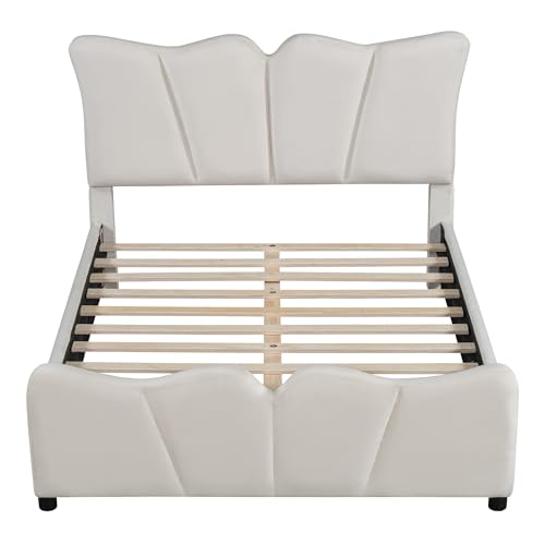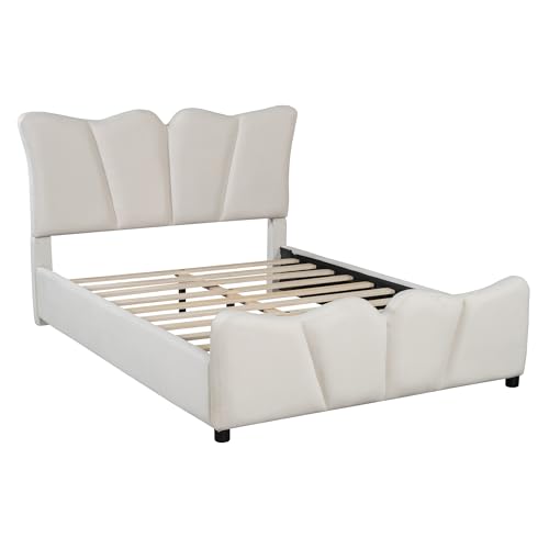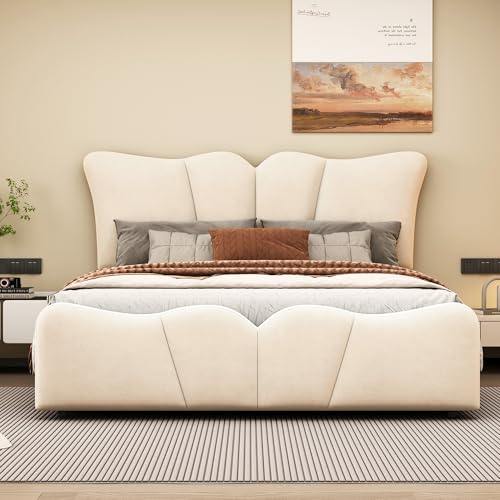 Twin Size Platform Bed, Upholstered Bed Frame with Unique Design Headboard or Bedroom, Velvet Fabric, Wood Slat Support, No Box Spring Needed, Easy Assembly (Beige)