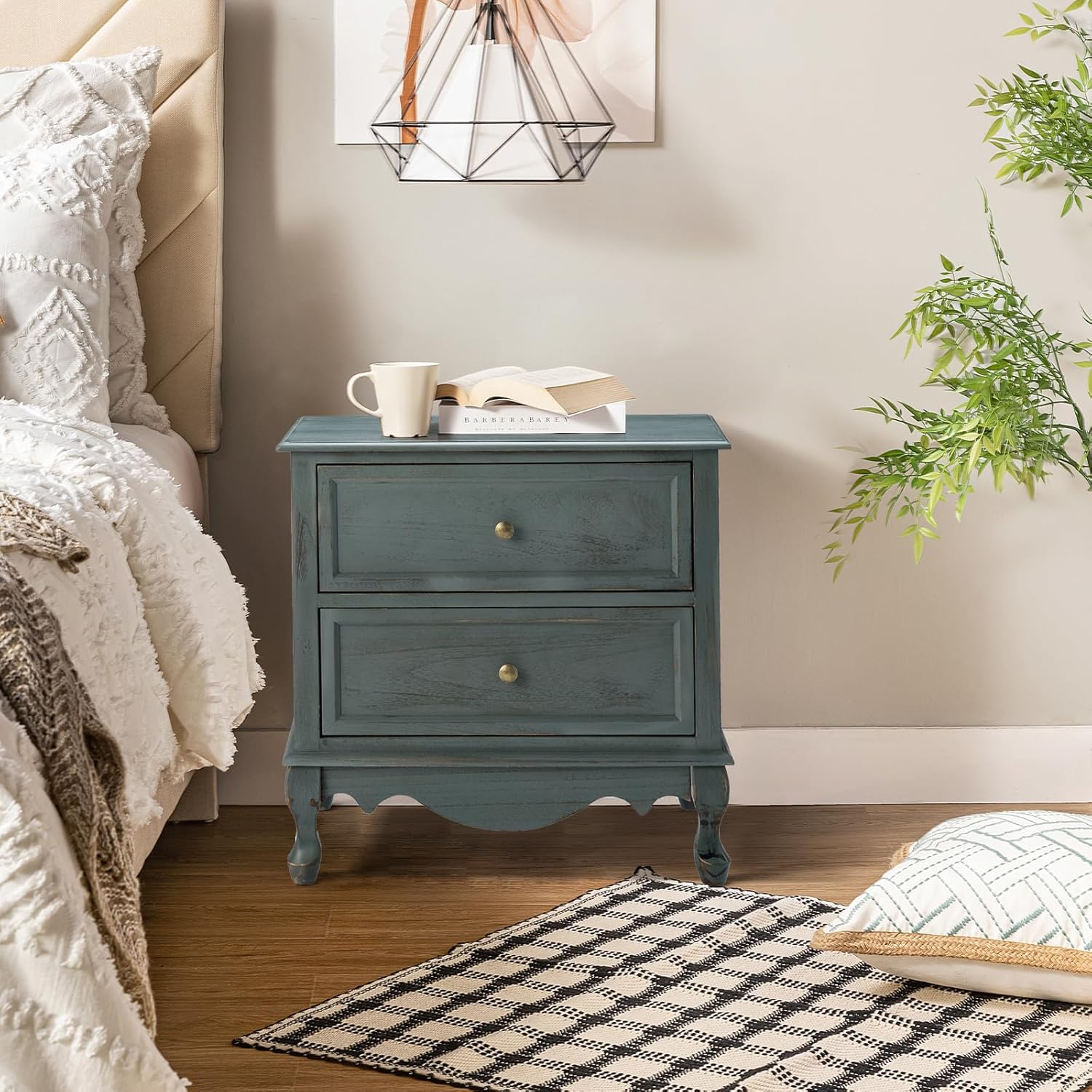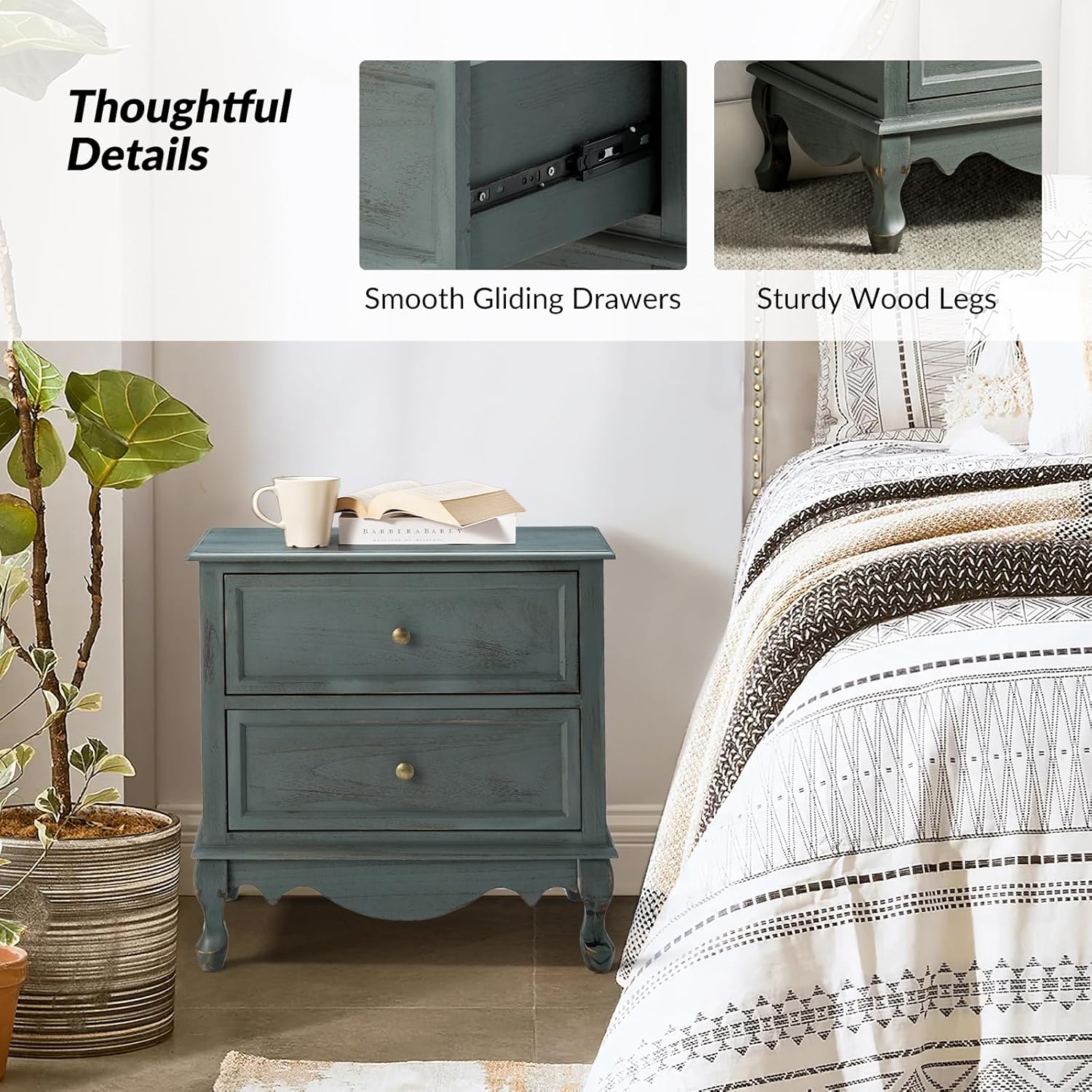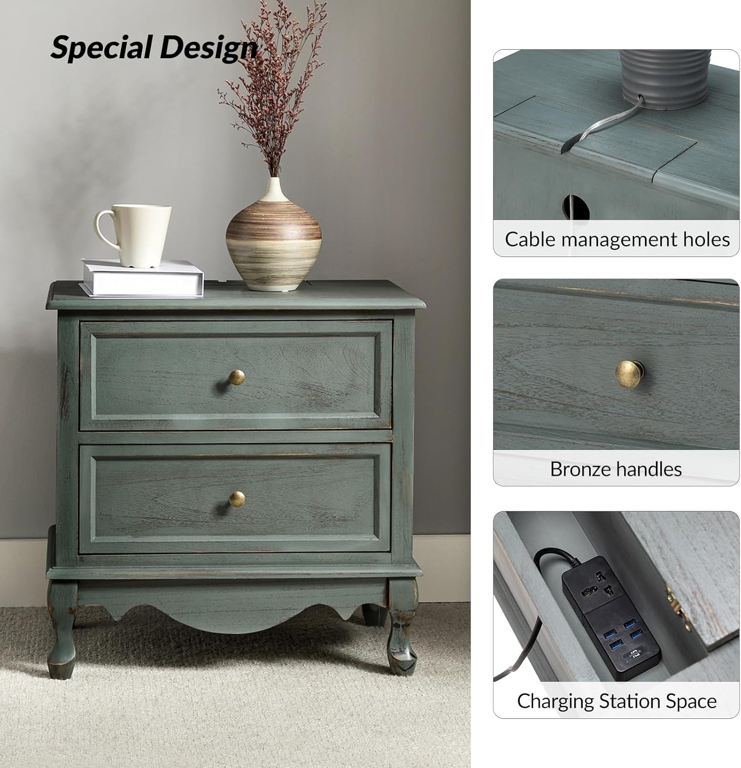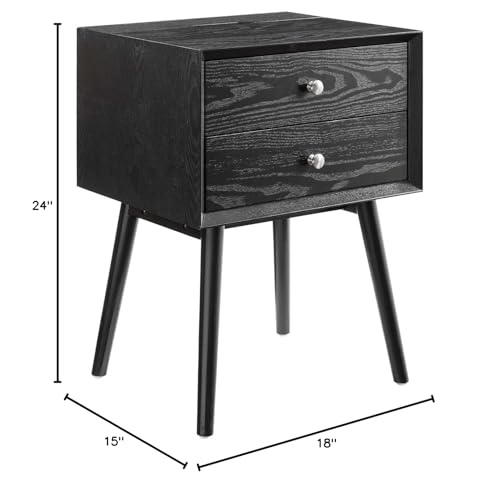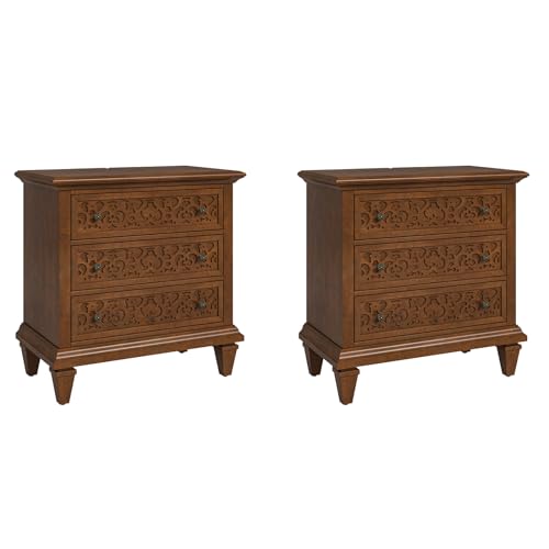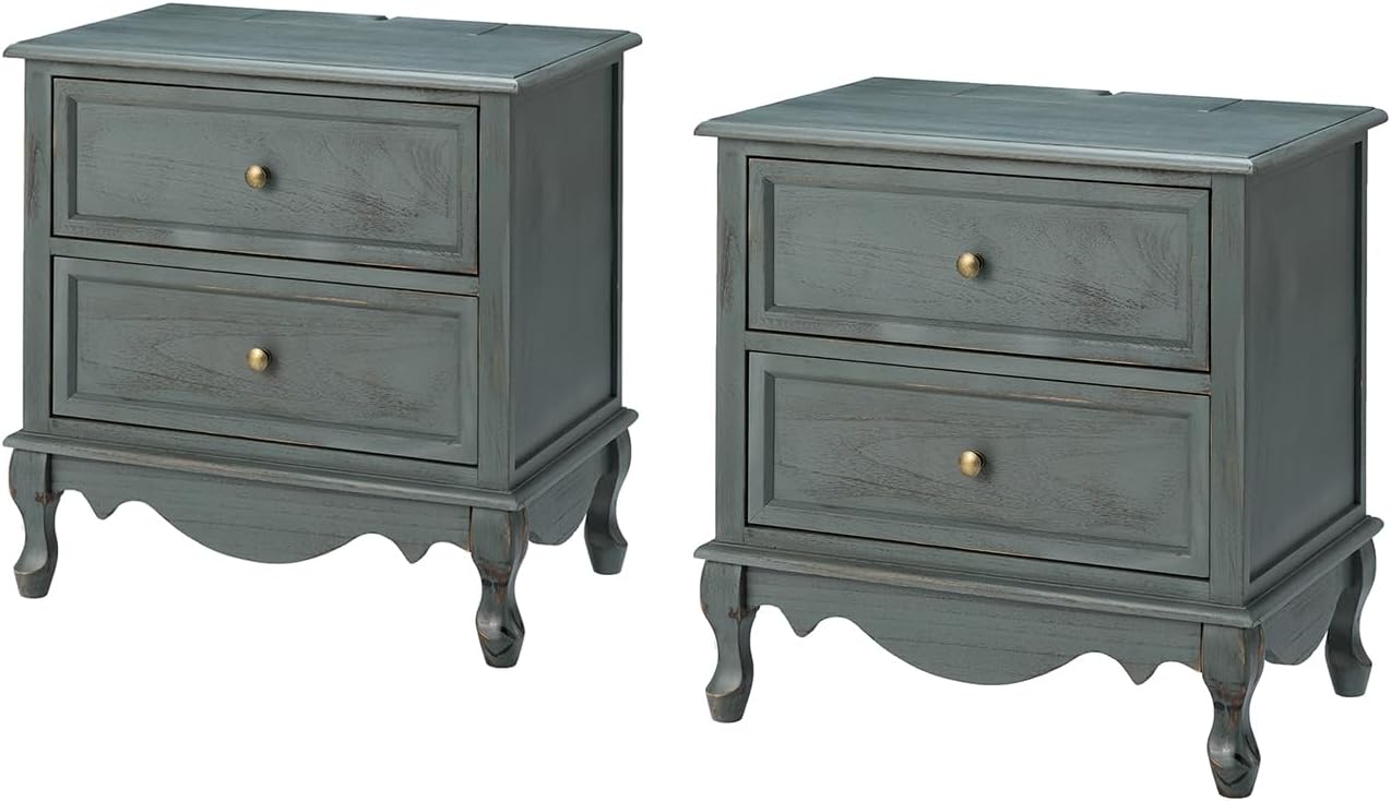 HULALA HOME Wood Nightstands Set of 2 with Charging Station Space, 24" W Bedside Tables with 2 Drawers, French Storage End Tables with Wooden Legs for Bedroom & Living Room, Walnut