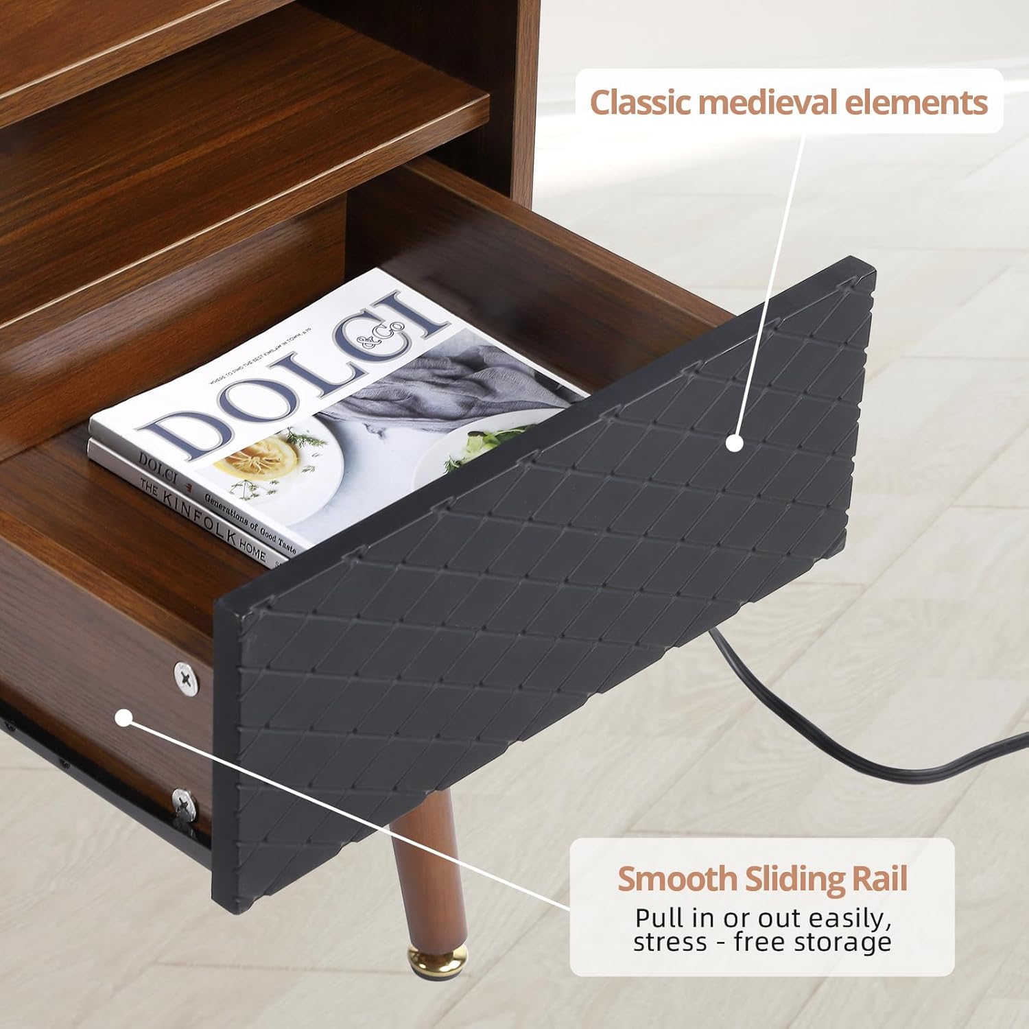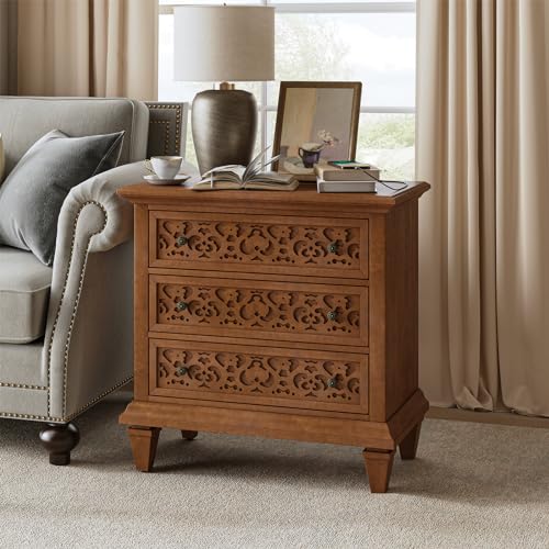 HULALA HOME Nightstand, Mid-Century Modern 3 Drawers for Bedroom, Small Bedside Table with Built-in Outlets, Bedside Furniture, End Table for Entryway, Closet,WALNUT