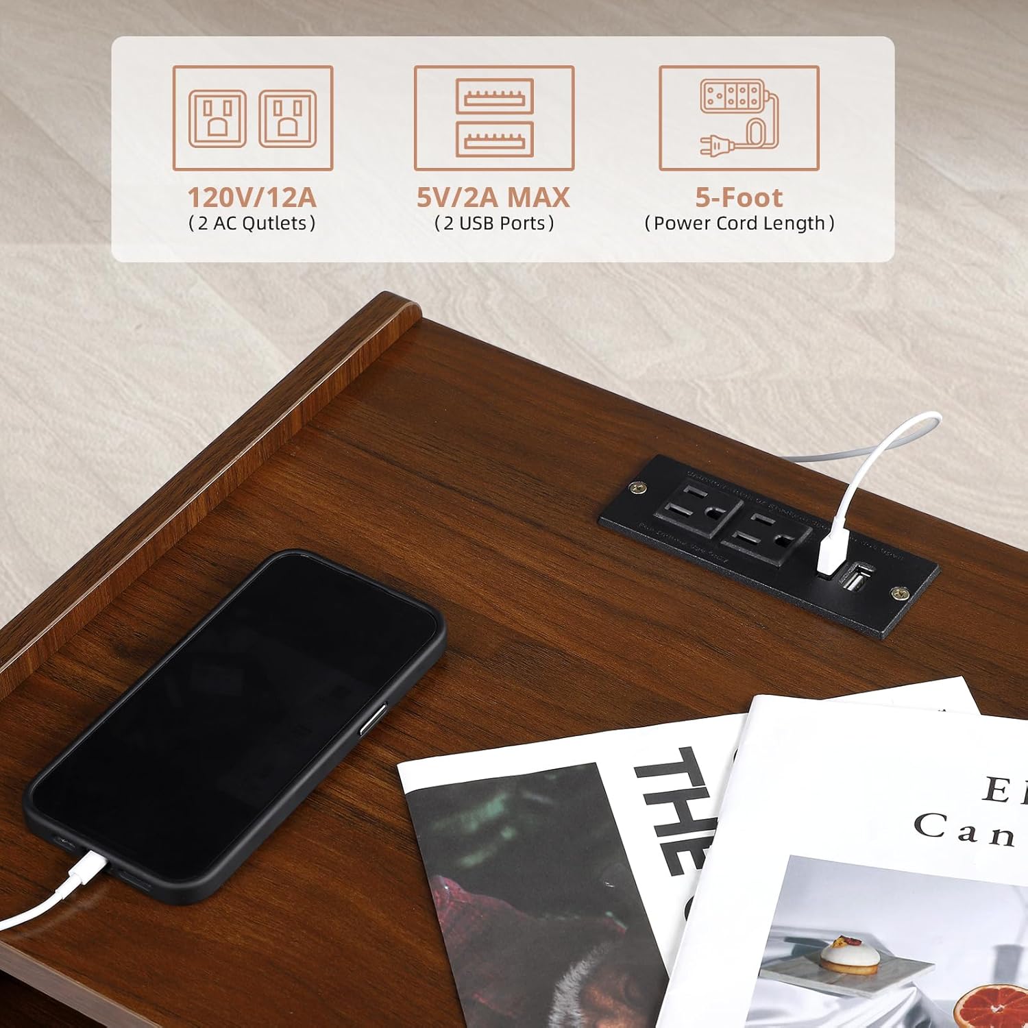 Nightstand with Charging Station, Bedside Table Set of 2, Walnut Side Table, Side Tables Living Room, Bedside Table with Drawers and Storage Shelves, Walnut & Black