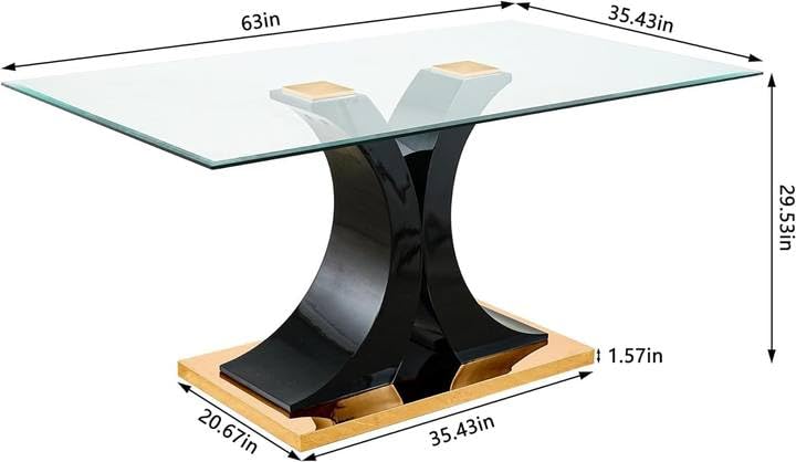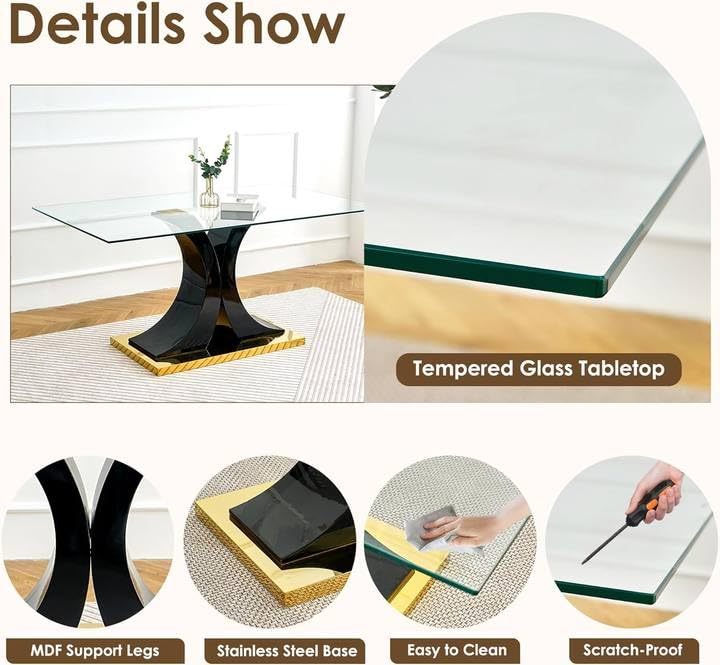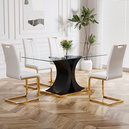 Dining Table Set for 6,Kitchen Rectangular Table Set,Glass Top with High Gloss Lacquered Legs,Dining Room Table Set with 6 Faux Leather Upholstered Chairs,for Kitchen,Black with Gold Base