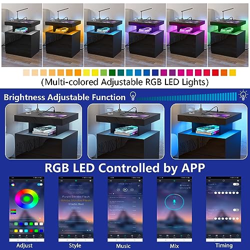 HOMMPA LED Nightstand with Wireless Charging Station & USB Ports High Gloss Bedside Table with LED Light RGB Adjustable Brightness Smart Nightstand 2 Drawers Night Stand for Bedroom Walnut