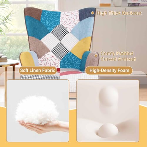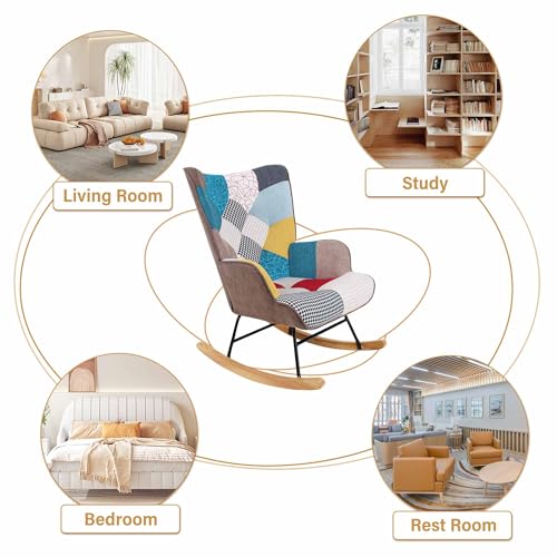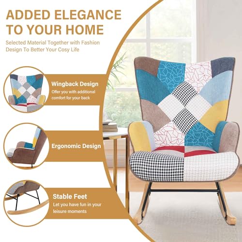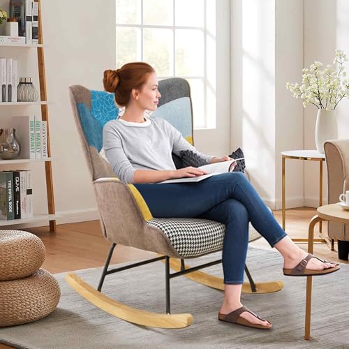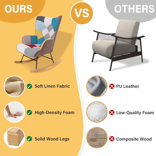 Nursery Rocking Chair,Upholstered Patchwork Linen Fabric Glider Rocker with High Backrest,Modern Rocking Accent Chairs,Rocker Accent Armchair with Solid Wood Legs for Nursery, Bedroom, Living Room
