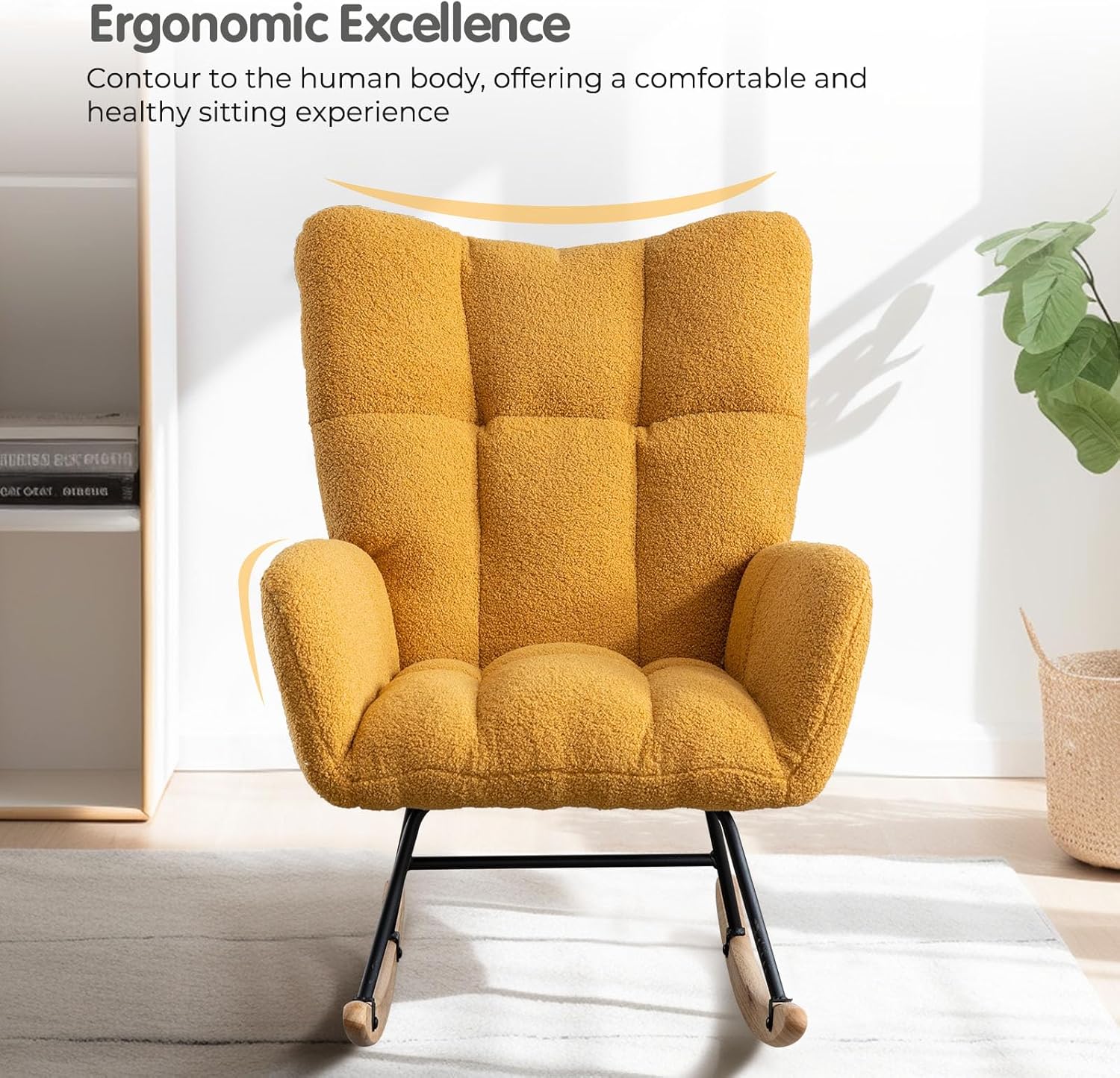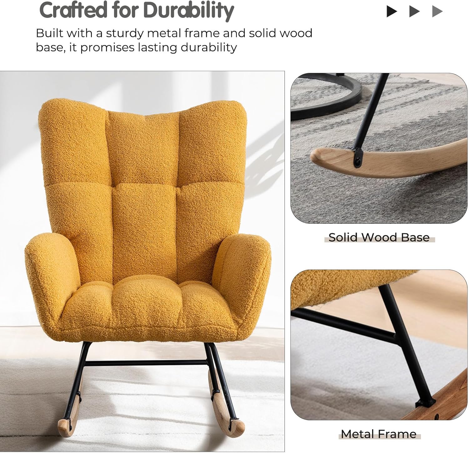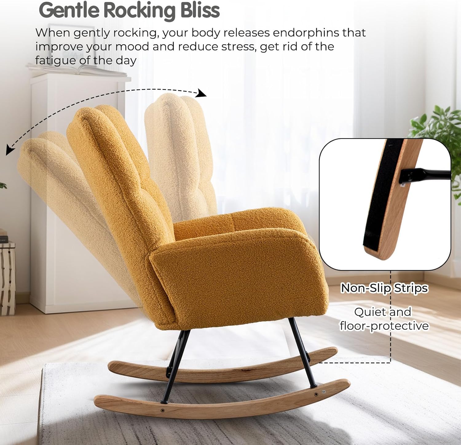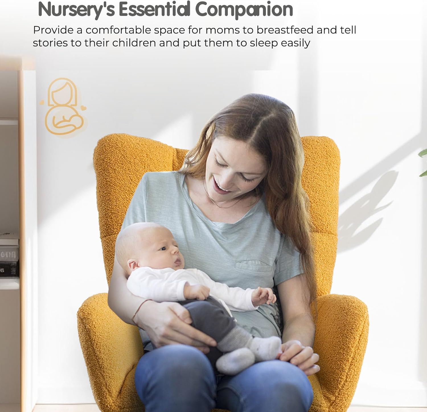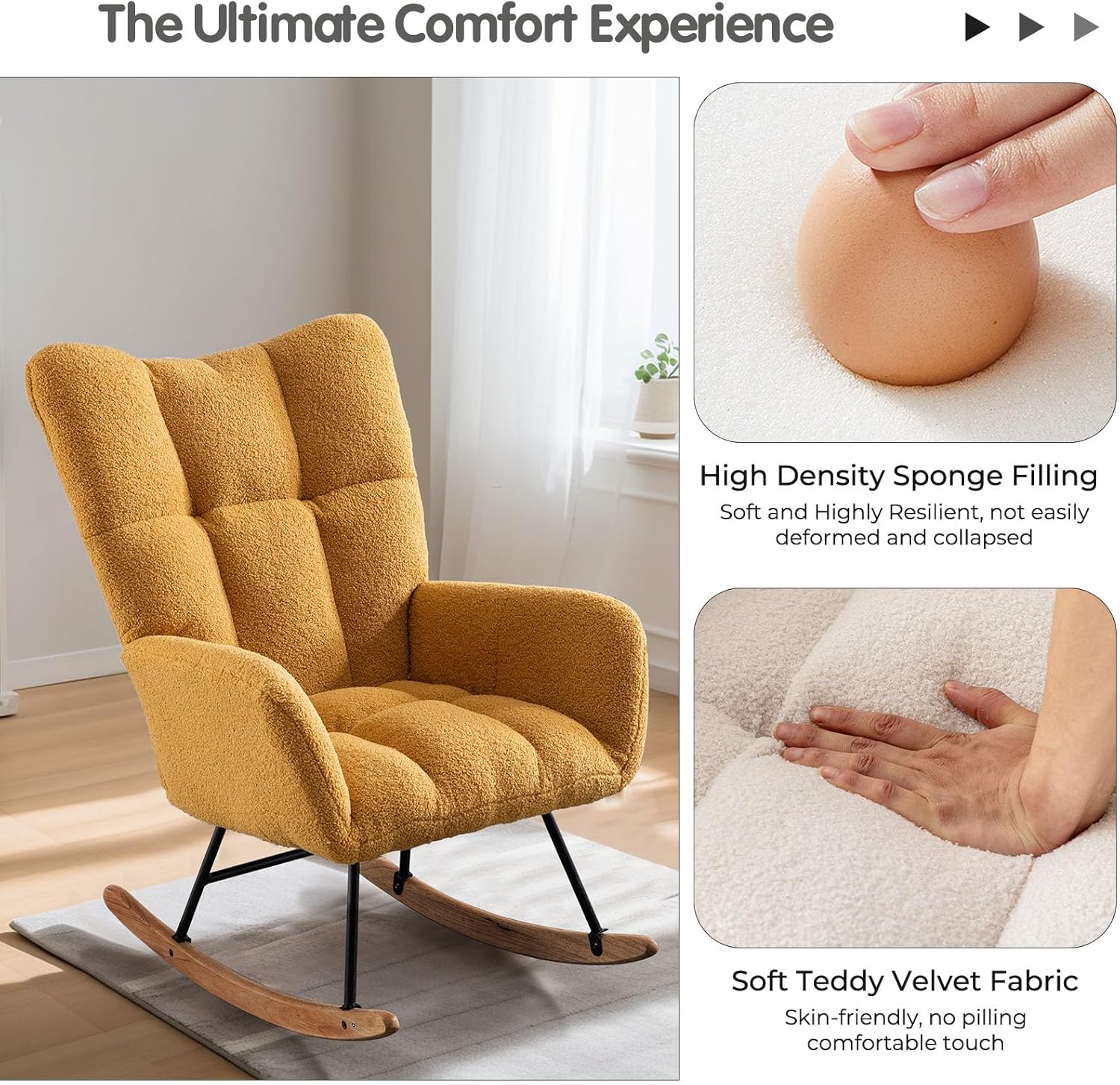 Rocking Chair Nursery Chair, Teddy Velvet Glider Rocker with High Backrest for Breastfeeding, Upholstered Glider Chair for Nursery Bedroom Living Room(Yellow)