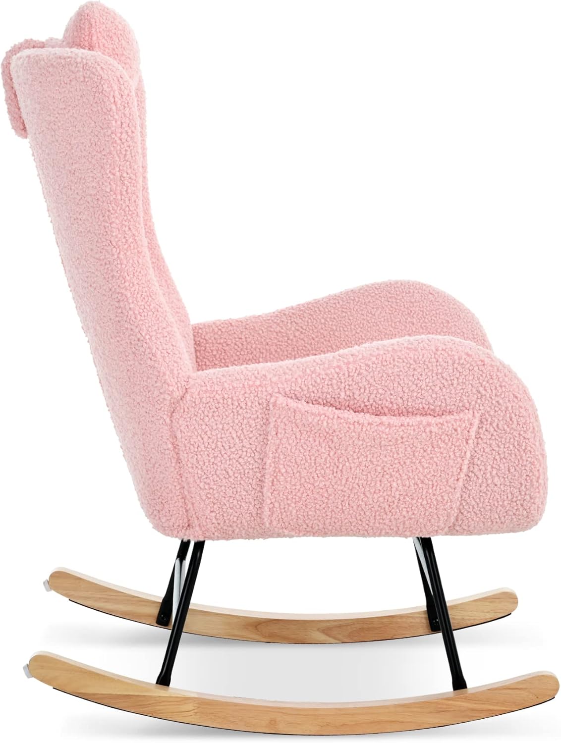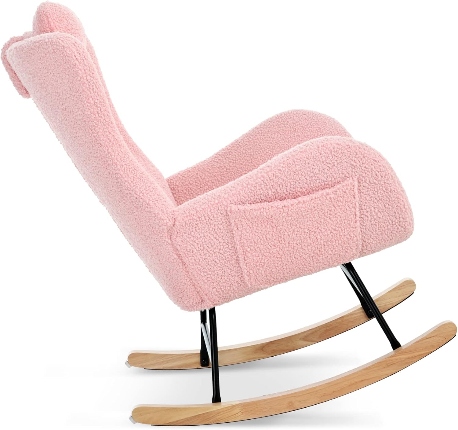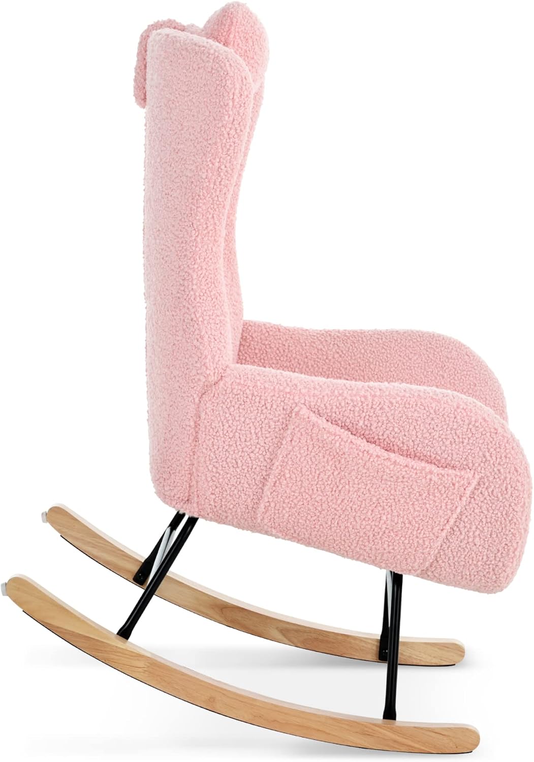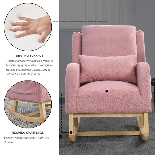 Rocking Chair Nursery, Teddy Upholstered Rocker Glider Chair with High Backrest, Adjustable Headrest & Pocket, Comfy Glider Chair for Nursery, Bedroom, Living Room, Offices, Rubber wood, pink