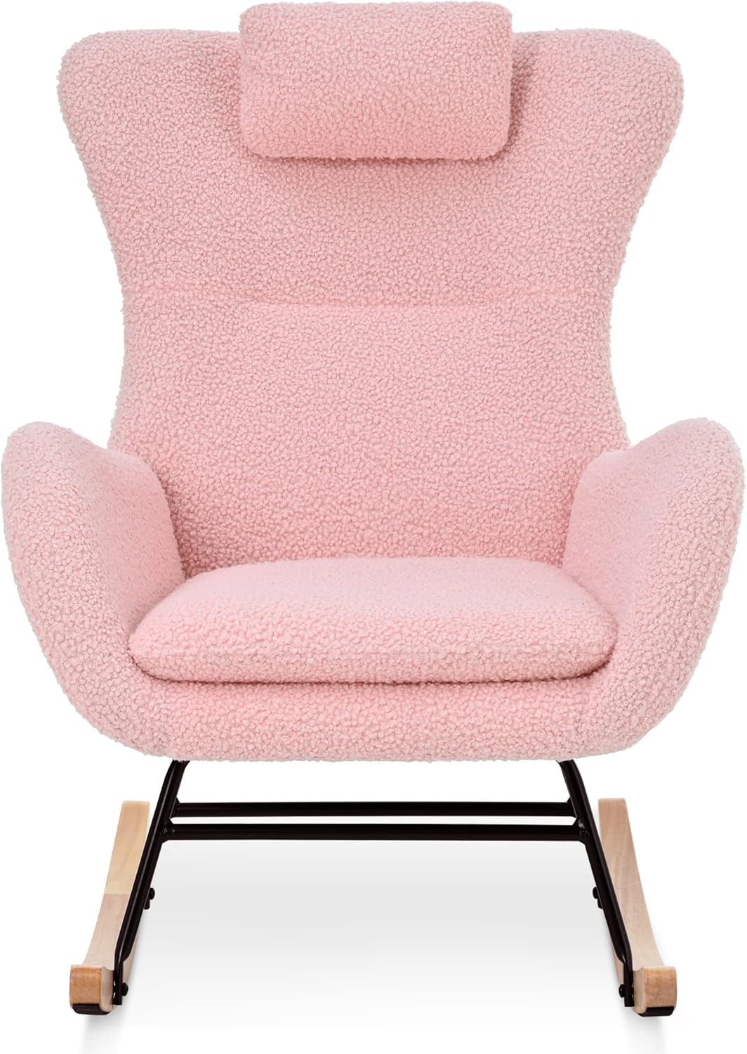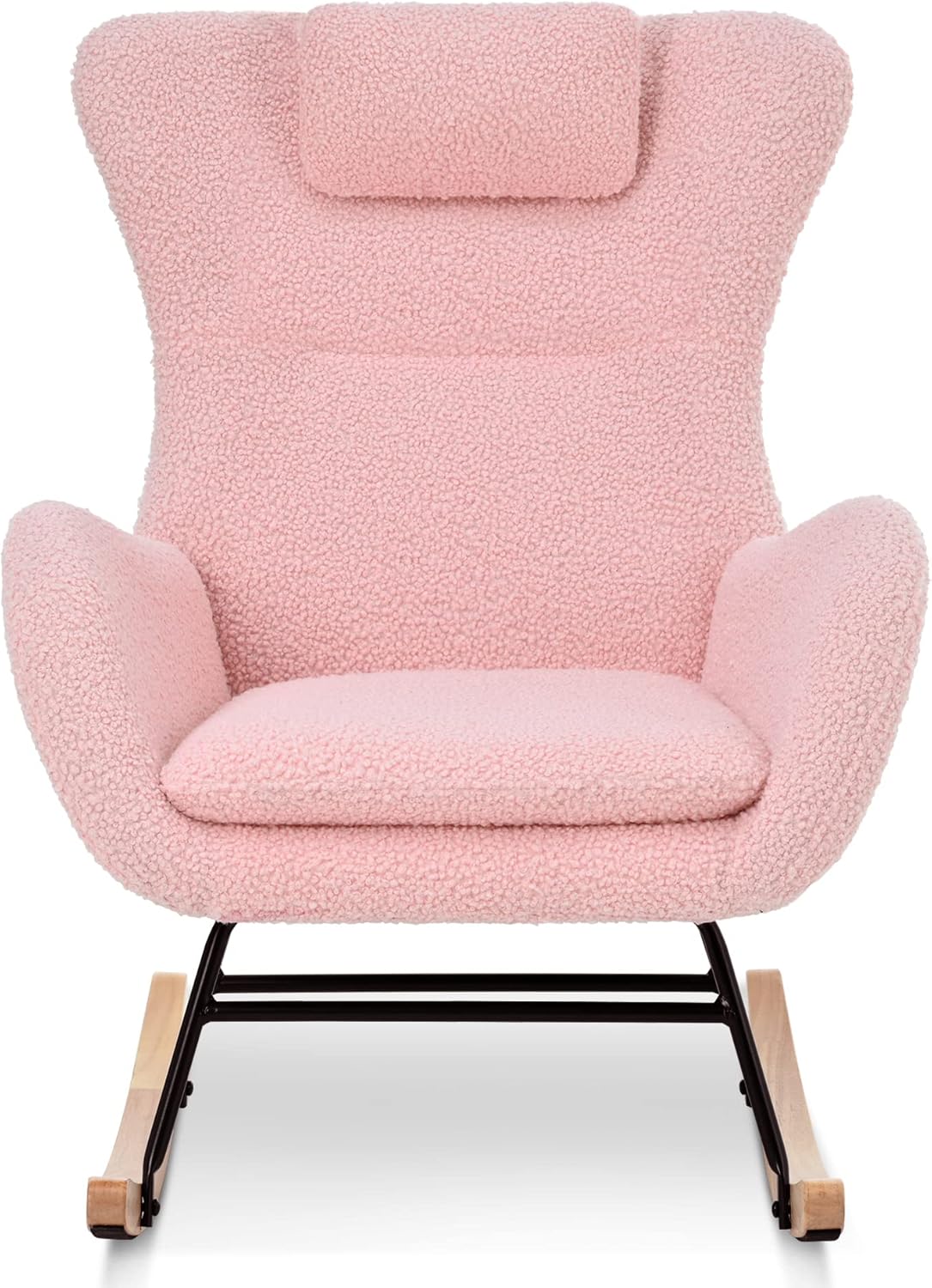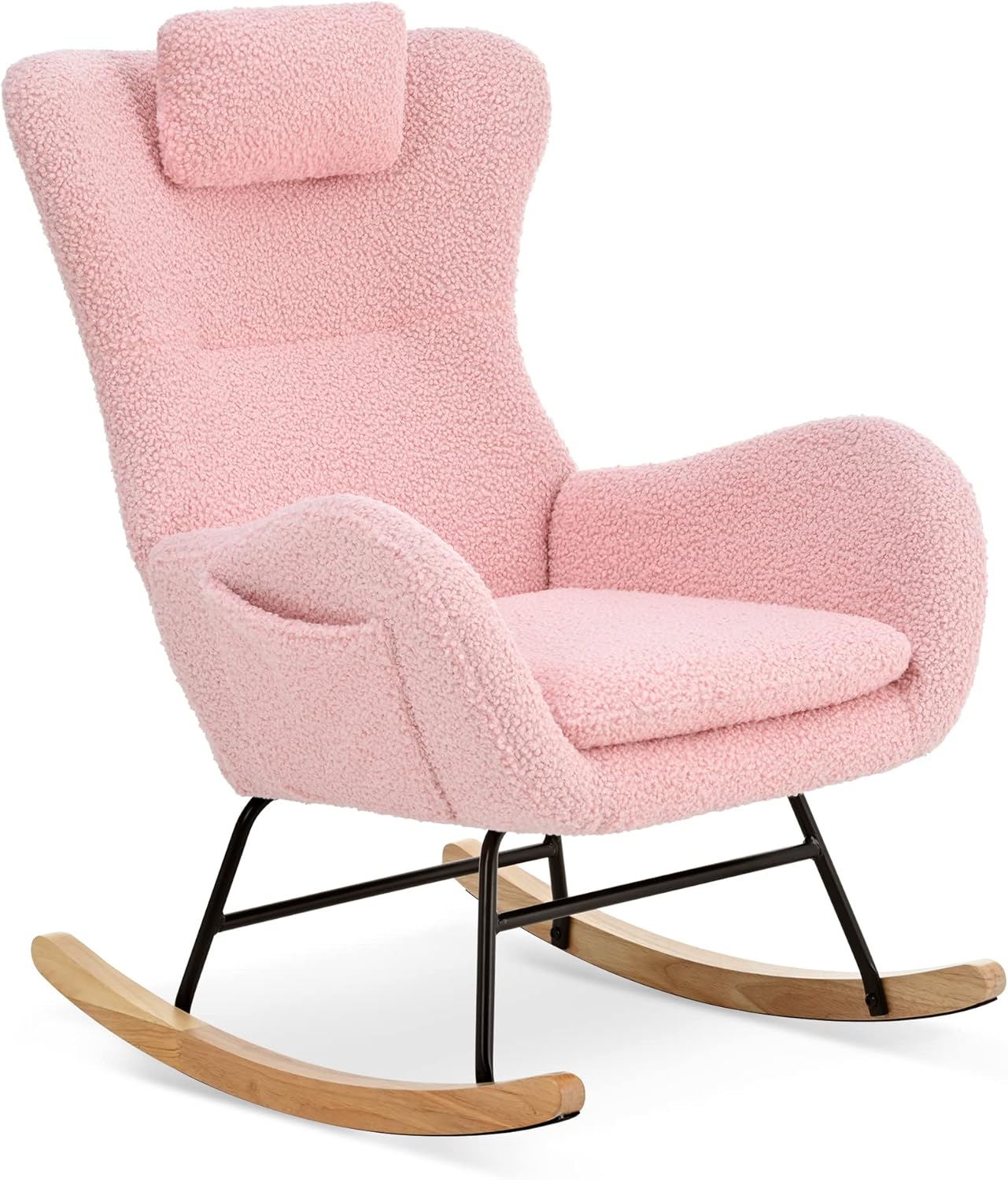 Rocking Chair Nursery, Teddy Upholstered Rocker Glider Chair with High Backrest, Adjustable Headrest & Pocket, Comfy Glider Chair for Nursery, Bedroom, Living Room, Offices, Rubber wood, pink