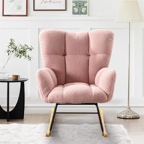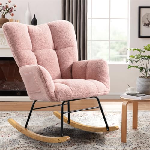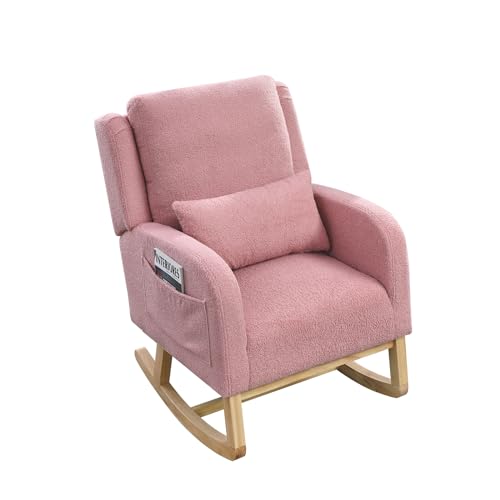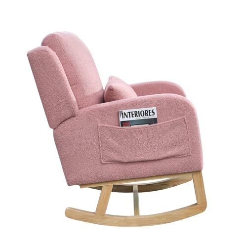 Modern Rocking Chair for Nursery, Upholstered Accent Rocker Single Sofa Armchair with High Back Backrest Armrest Side Pocket for Living Room Baby Room Bedroom Office Pink Teddy