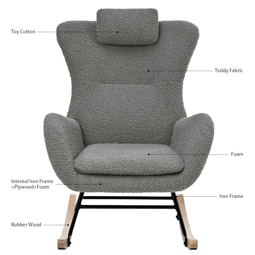 Modern Rocking Chair Recliner, Comfy Rocker Nursery Chair with Footrest, Accent Reading Chair, Upholstered Lounge Chair for Relaxing, Resting,Soft Padded Rocker for Indoor Living Room Bedroom,Gray