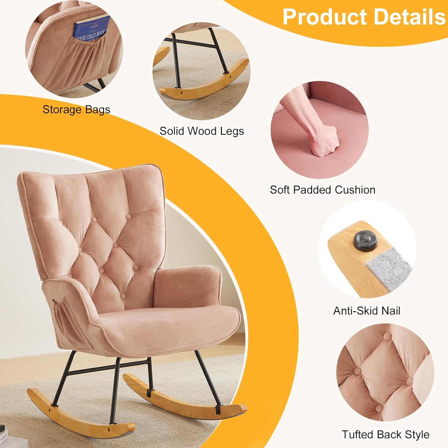 Modern Tufted Upholstered Nursery, Glider Rocker with High Backrest Rocking Chair, Yellow Velvet