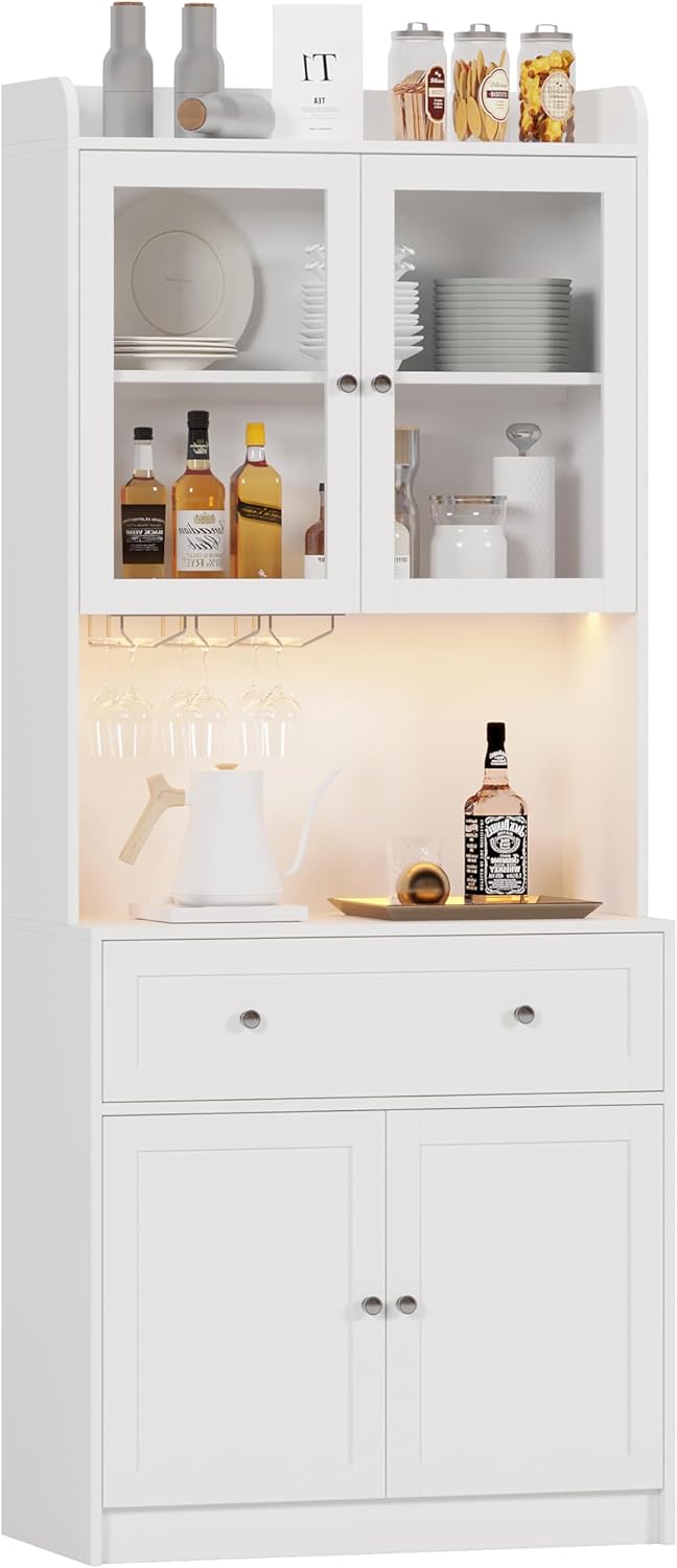 75.2" Tall Kitchen Pantry Storage Cabinet with Lights and Charging Station, Modern Kitchen Hutch Bar Cabinet with Microwave Stand, Wood Buffet Sideboard with 1 Drawer for Kitchen, Dining Room