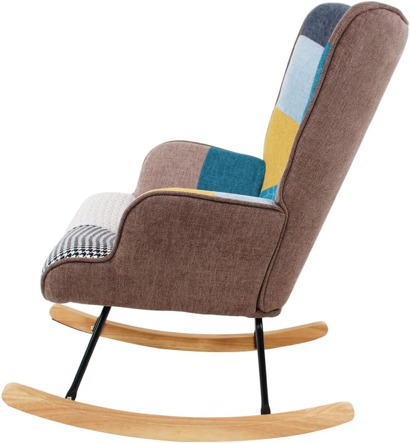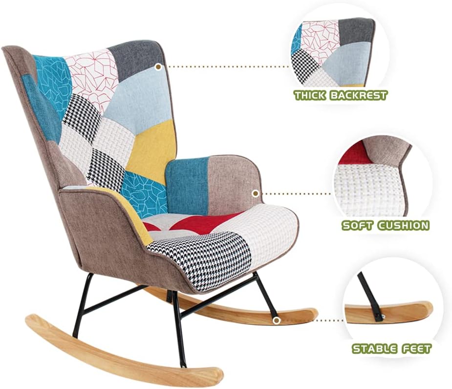 Nursery Rocking Chair Upholstered Fabric Glider Chair High Backrest Armchair Chair for Living Room Bedroom Apartment, Colorful Patchwork Linen, Wood Legs